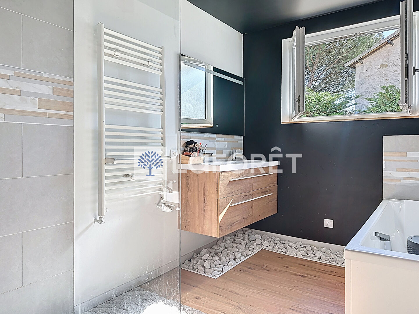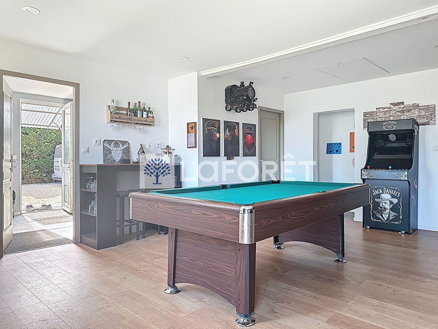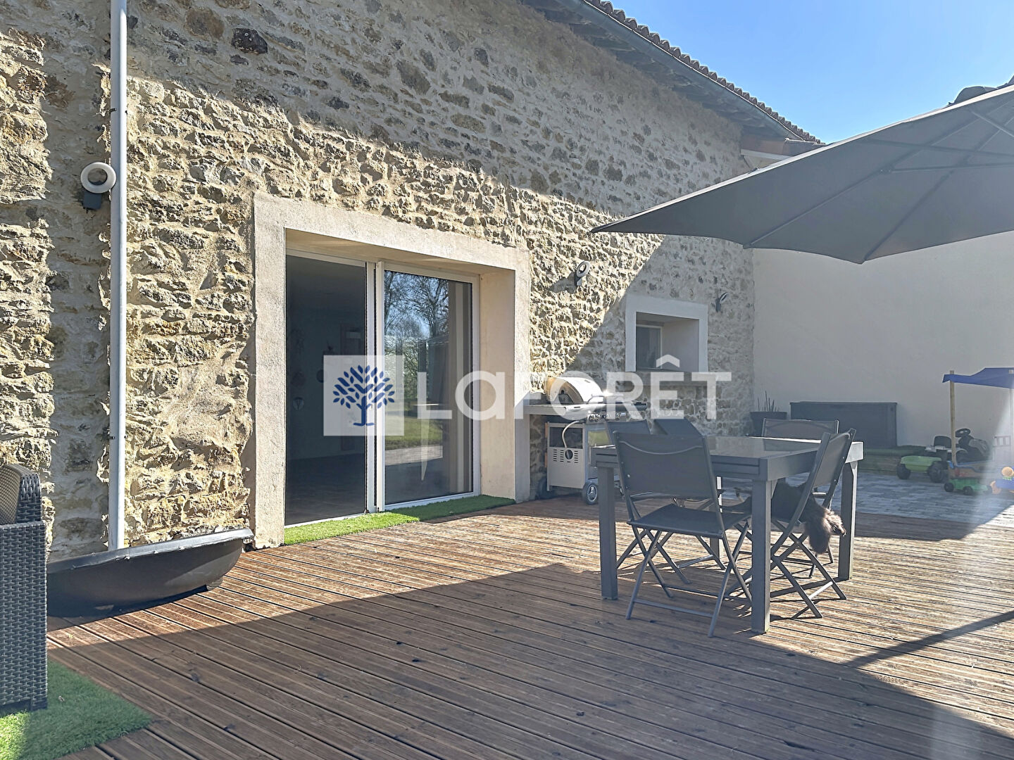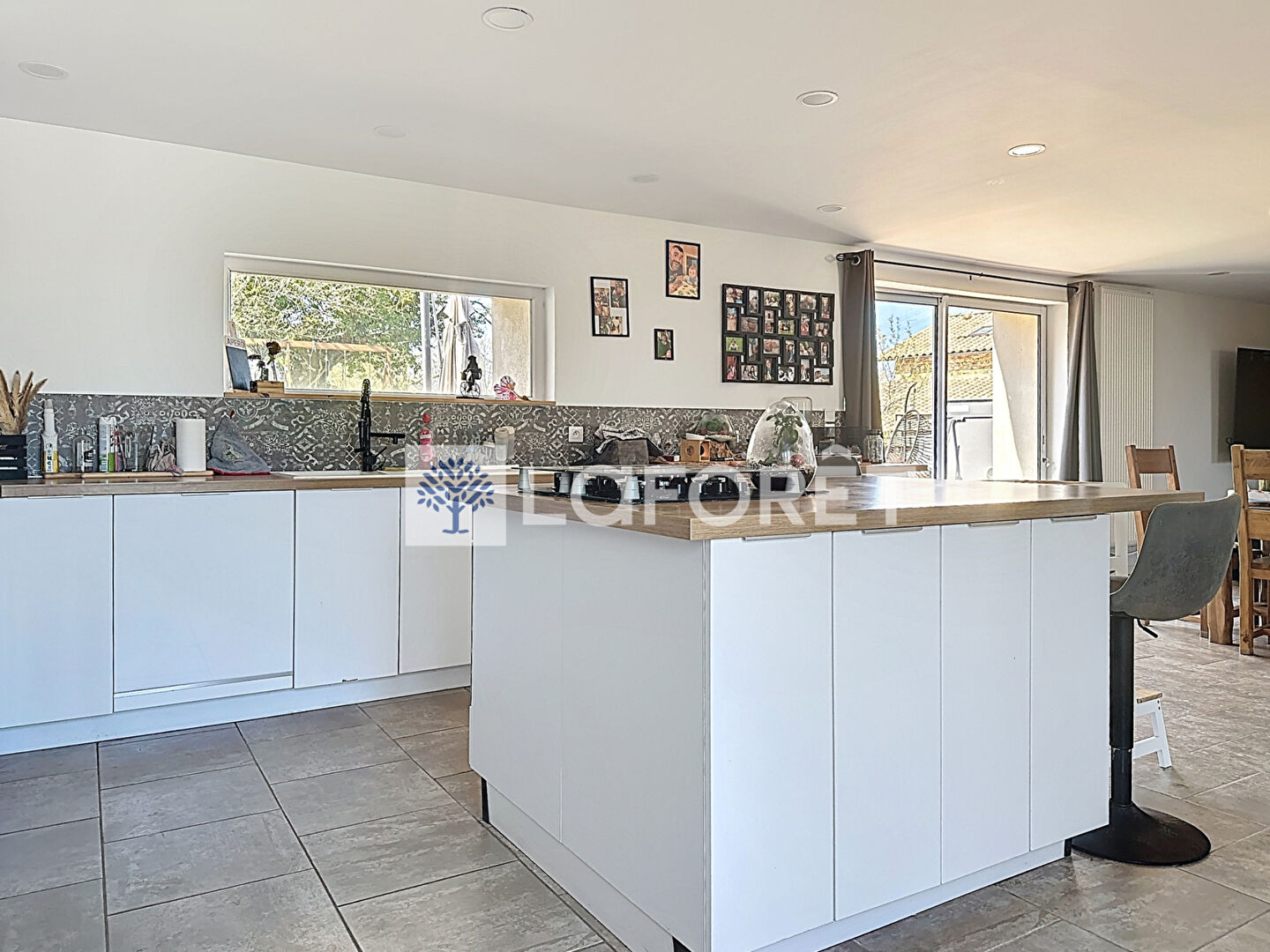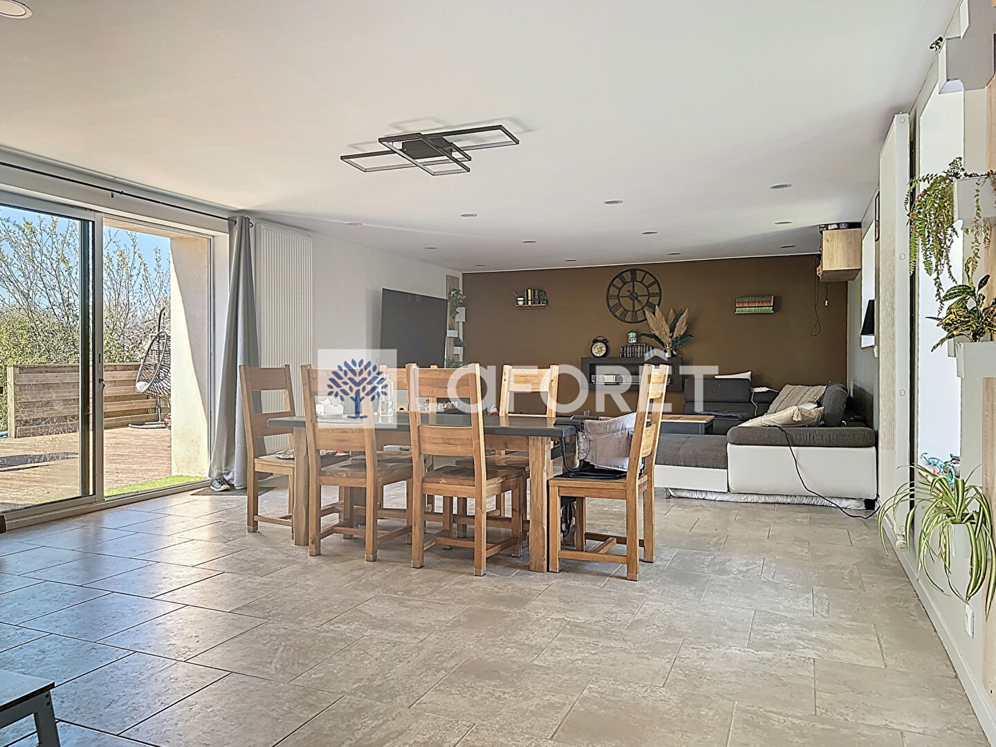 Une grande baie vitrée prolonge naturellement cet espace vers une agréable terrasse en bois, parfaite pour profiter des beaux jours.