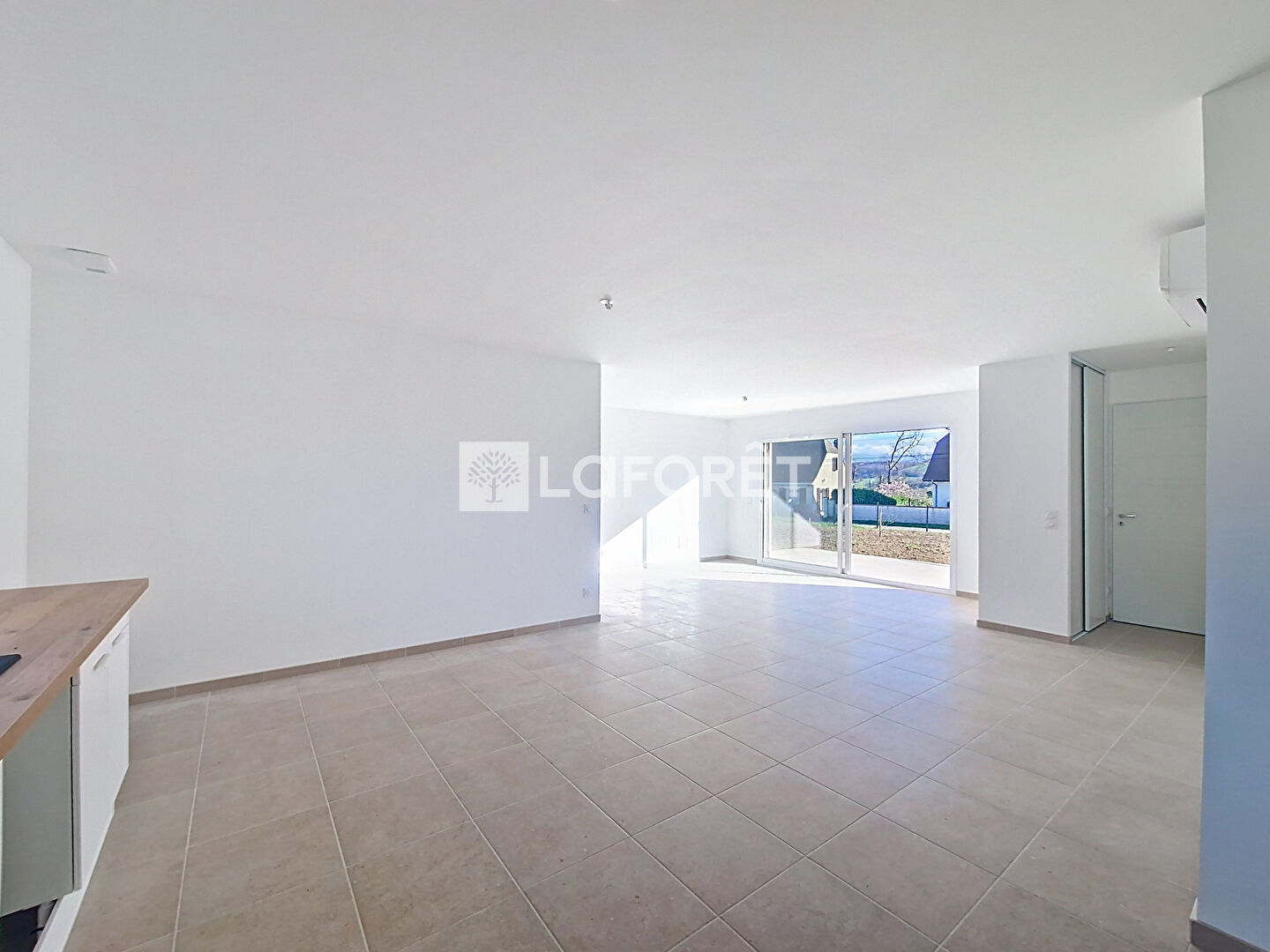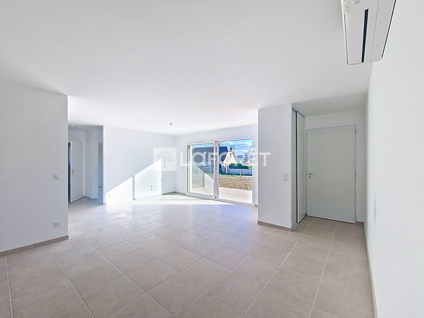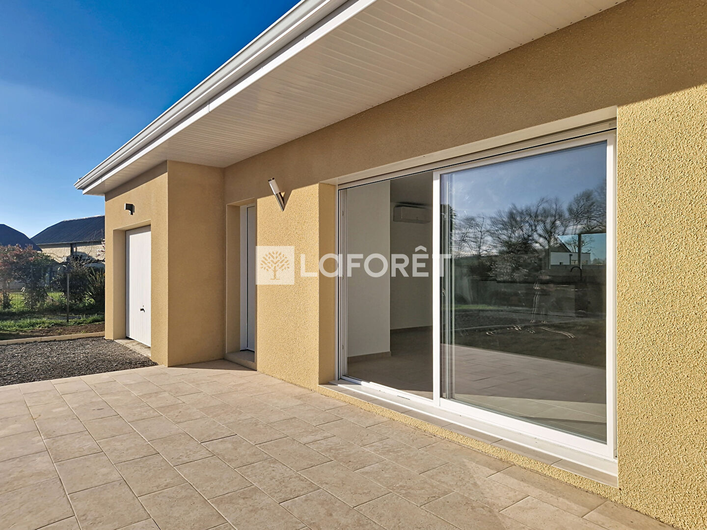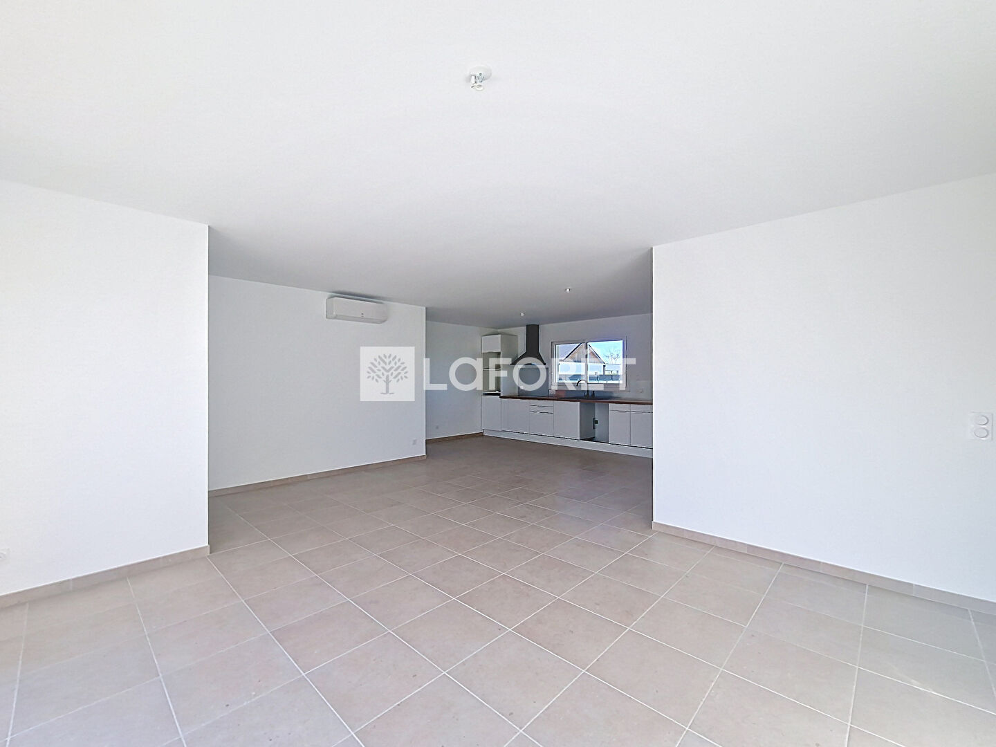 D'une conception fonctionnelle, la maison propose une entrée avec placard et une spacieuse pièce de vie d'environ 44 m², lumineuse et conviviale, intégrant une cuisine aménagée et équipée d'une climatisation, avec un accès direct vers l'extérieur avec une terrasse d'environ 20 m².