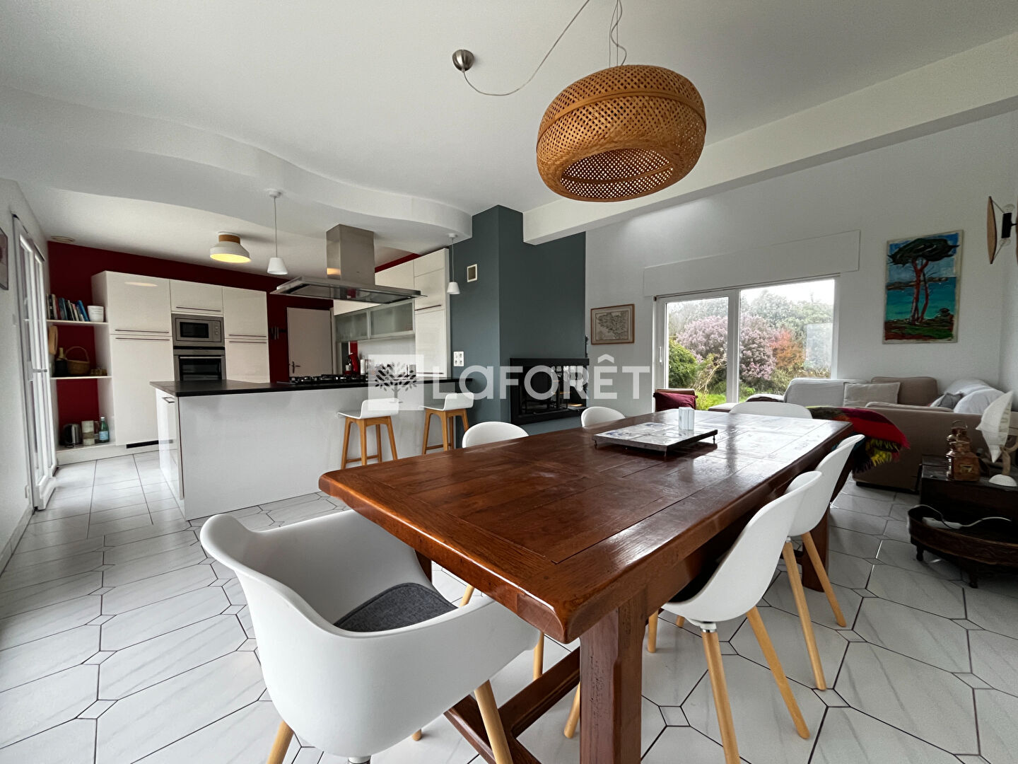 Séjour 45 m² avec cheminée, cuisine équipée, 3 chambres, salle de bains avec douche et baignoire, wc.