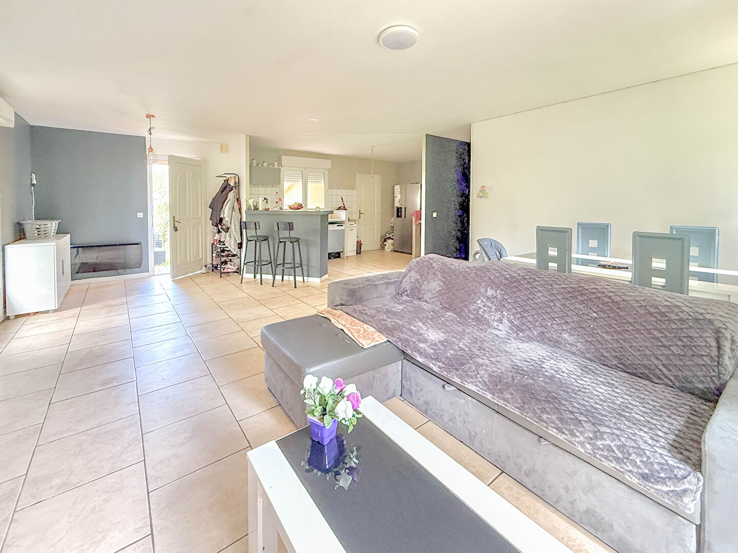 Vous y trouverez une spacieuse pièce de vie avec cuisine ouverte, trois chambres, une salle d'eau et des WC indépendants.