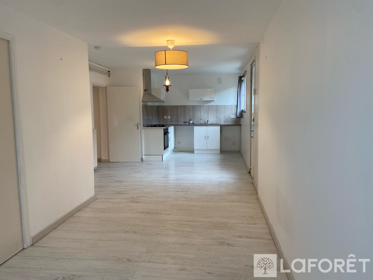Une pièce de vie avec cuisine aménagée, semi équipée (Plaques et hotte) et salon, une chambre avec dressing et une salle d'eau.