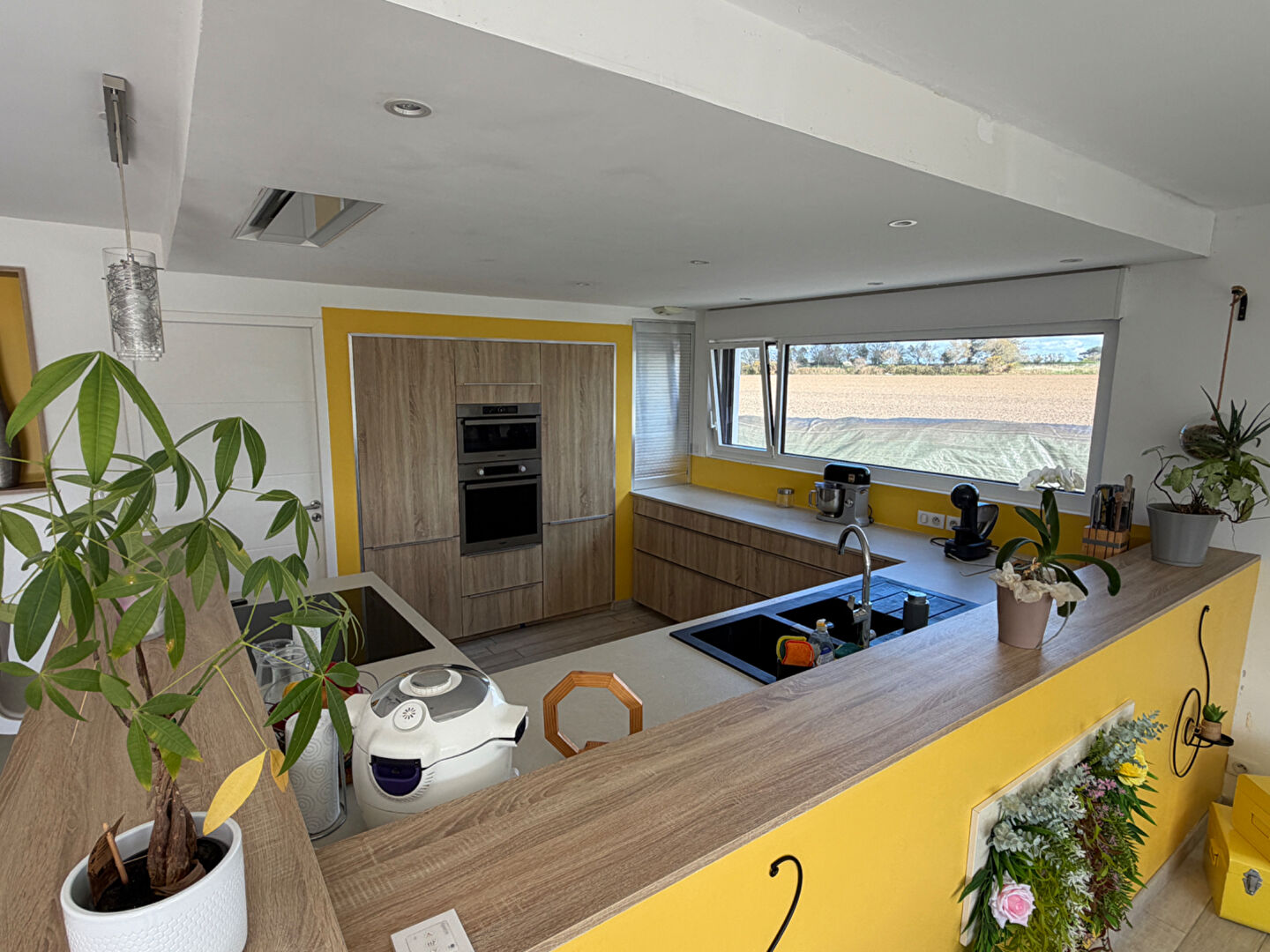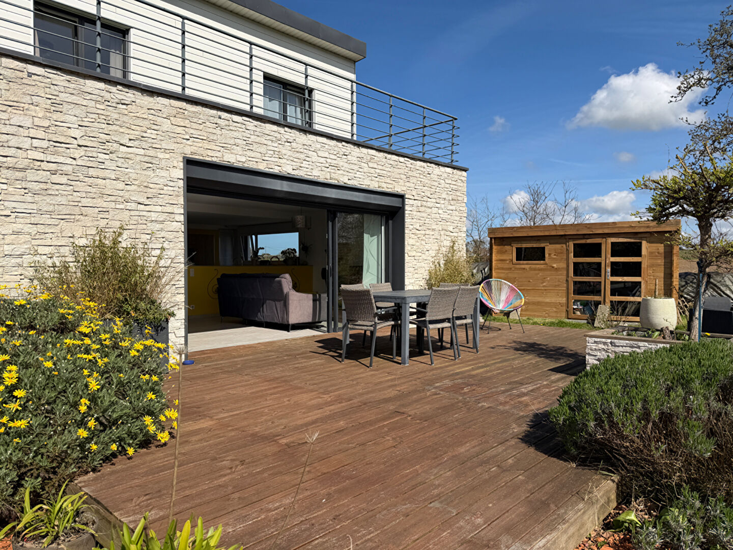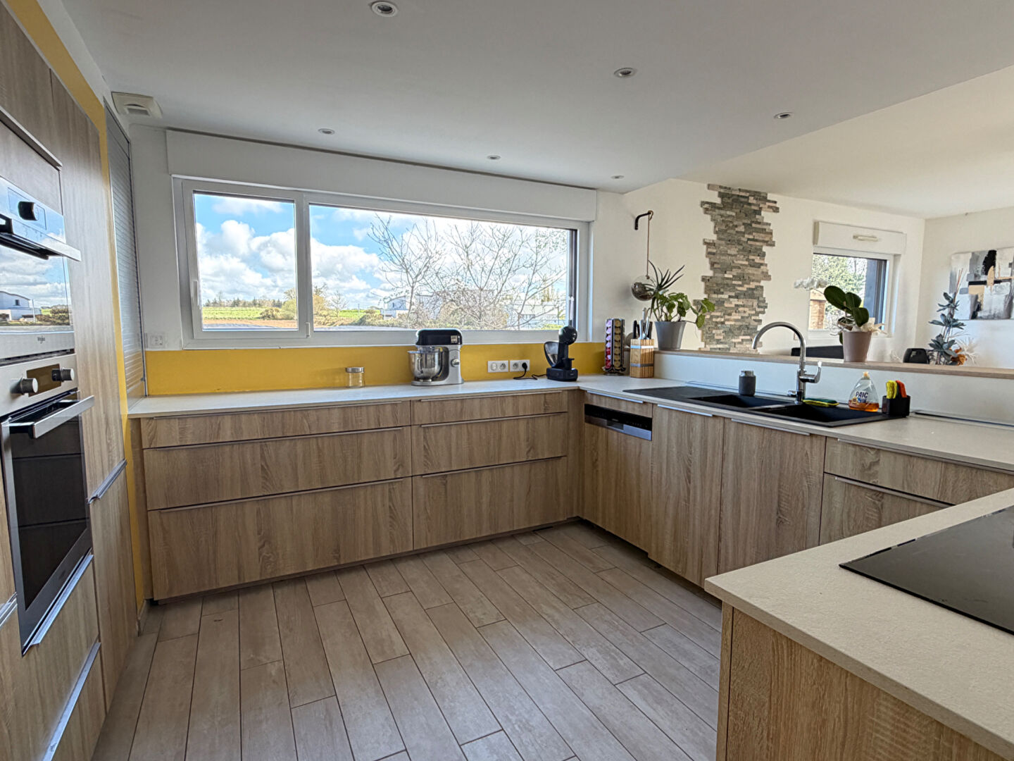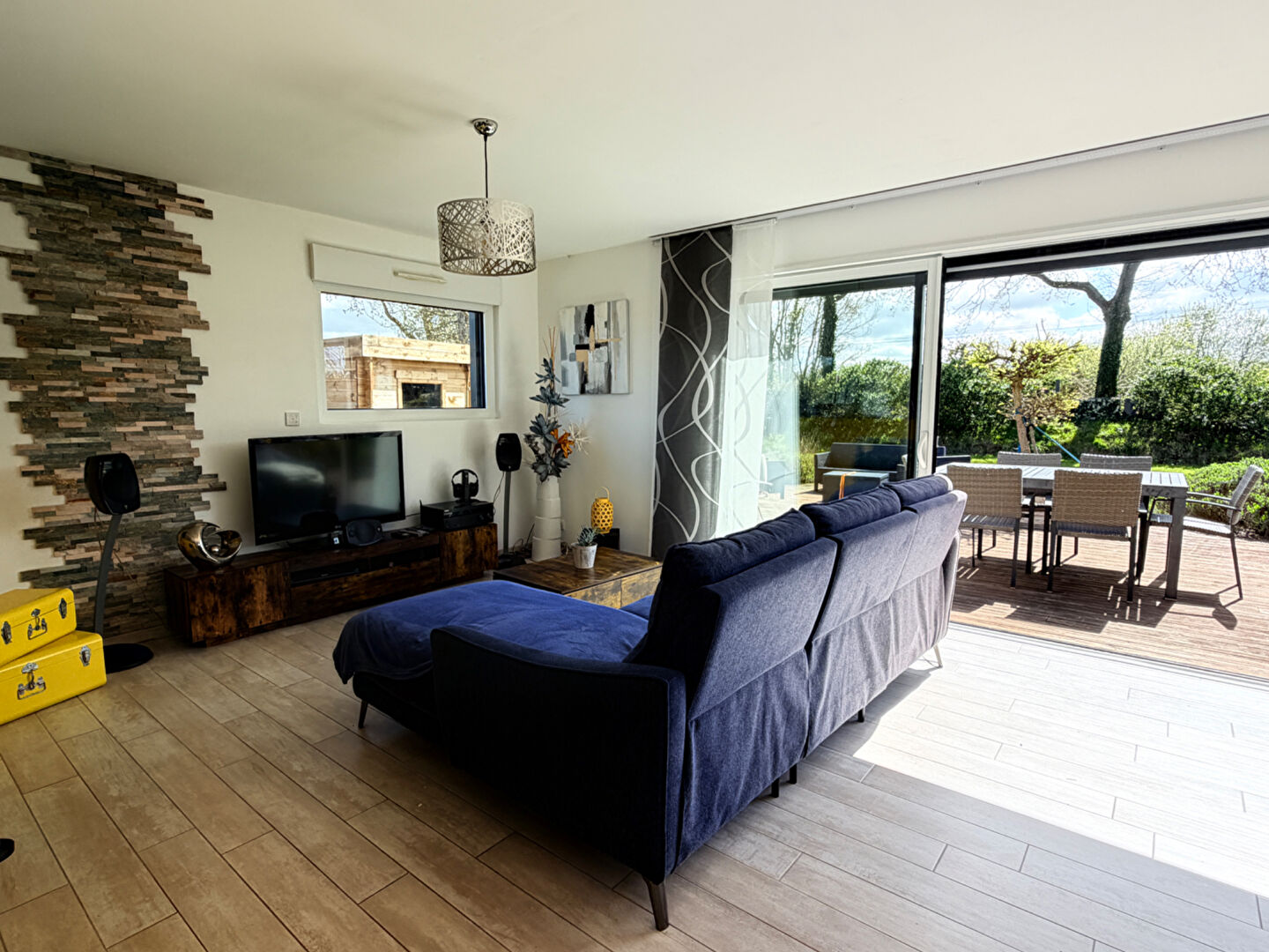 Dès l'entrée, vous serez séduit par une superbe pièce de vie baignée de lumière, sublimée par une large baie vitrée à galandage ouvrant pleinement sur l'extérieur.