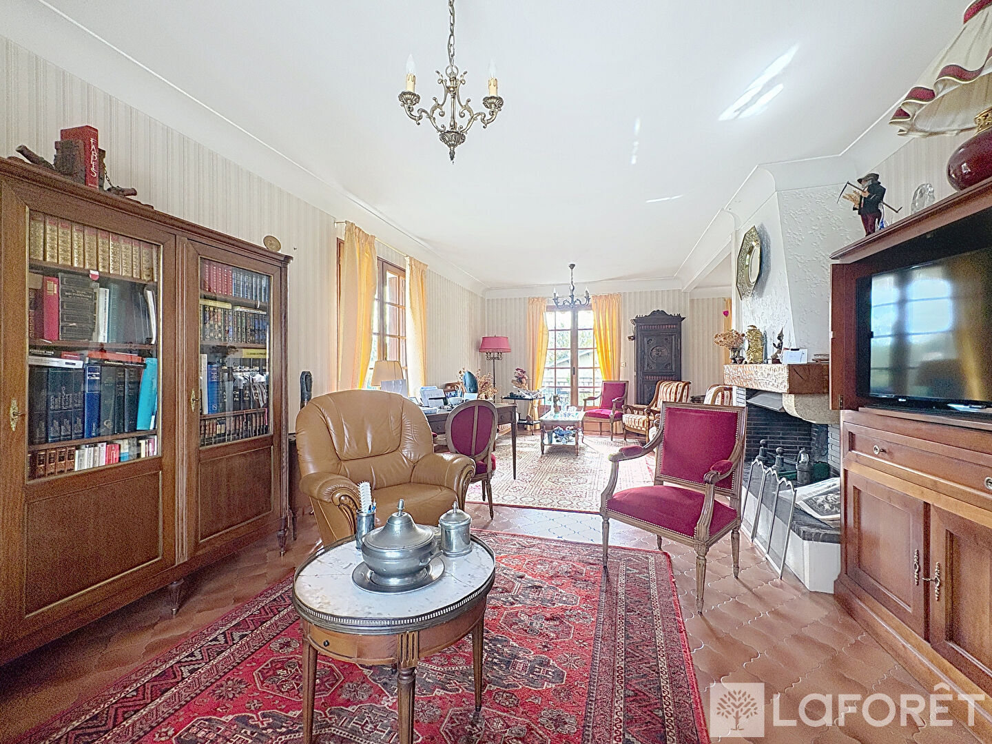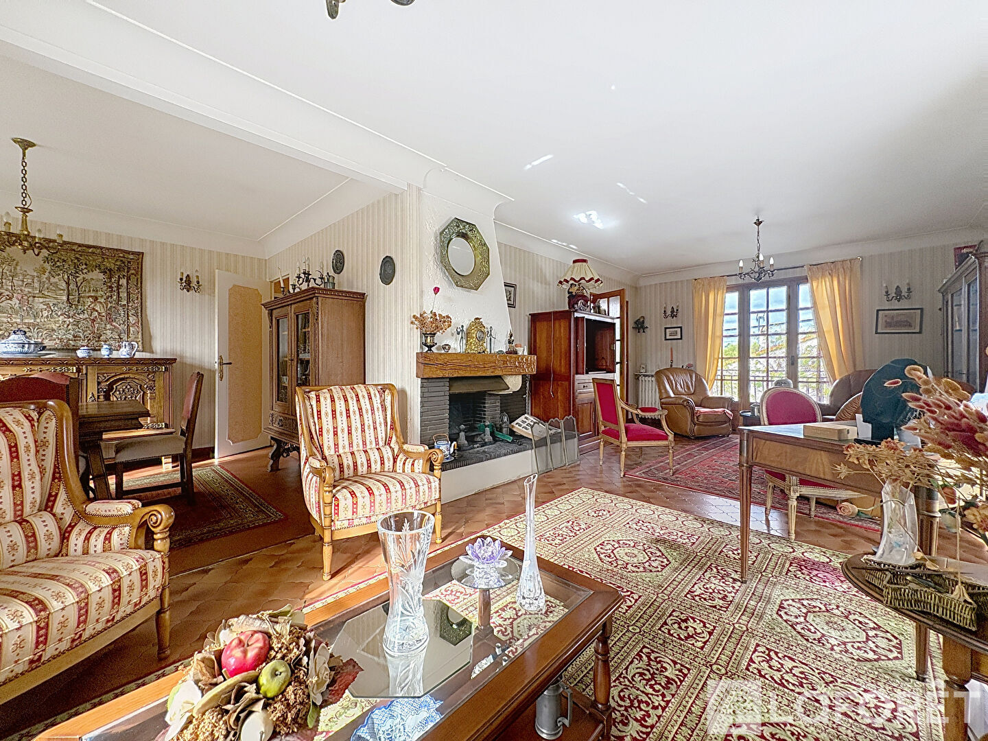 Elle se compose d'une entrée, d'un vaste séjour double de 45 m² avec cheminée, orienté sud-ouest et ouvrant sur une superbe terrasse d'environ 80 m², d'une cuisine indépendante, de cinq chambres, de deux salles d'eau, deux WC, ainsi que d'une buanderie/chaufferie.