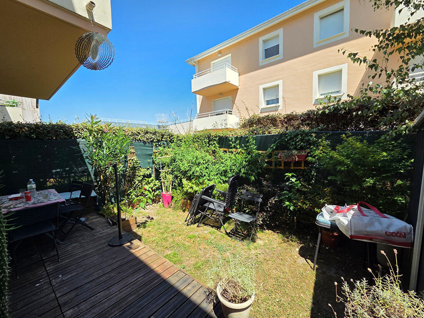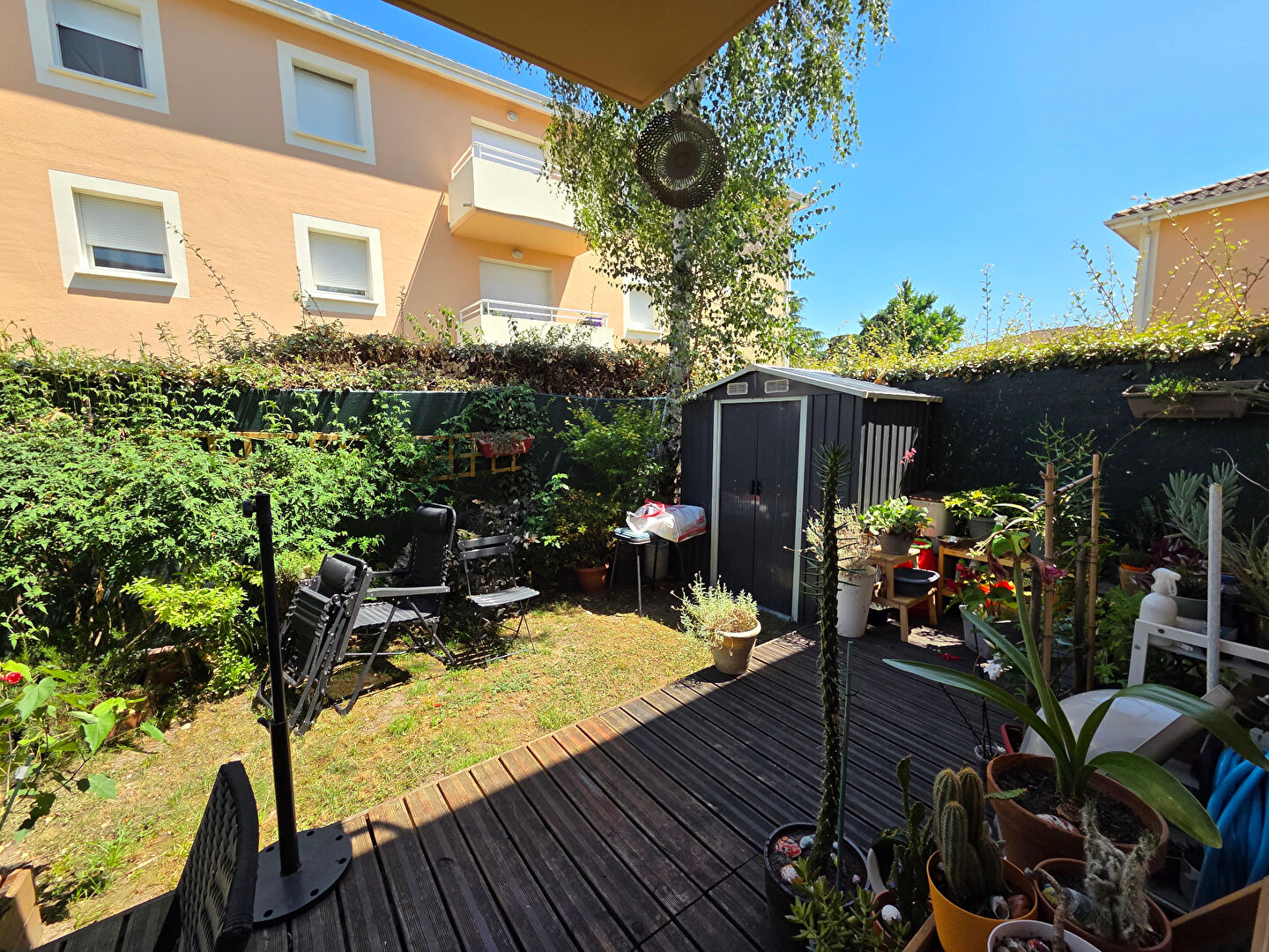 Un jardin privatif de 30 m² avec terrasse en bois de 13 m² et abri de jardin