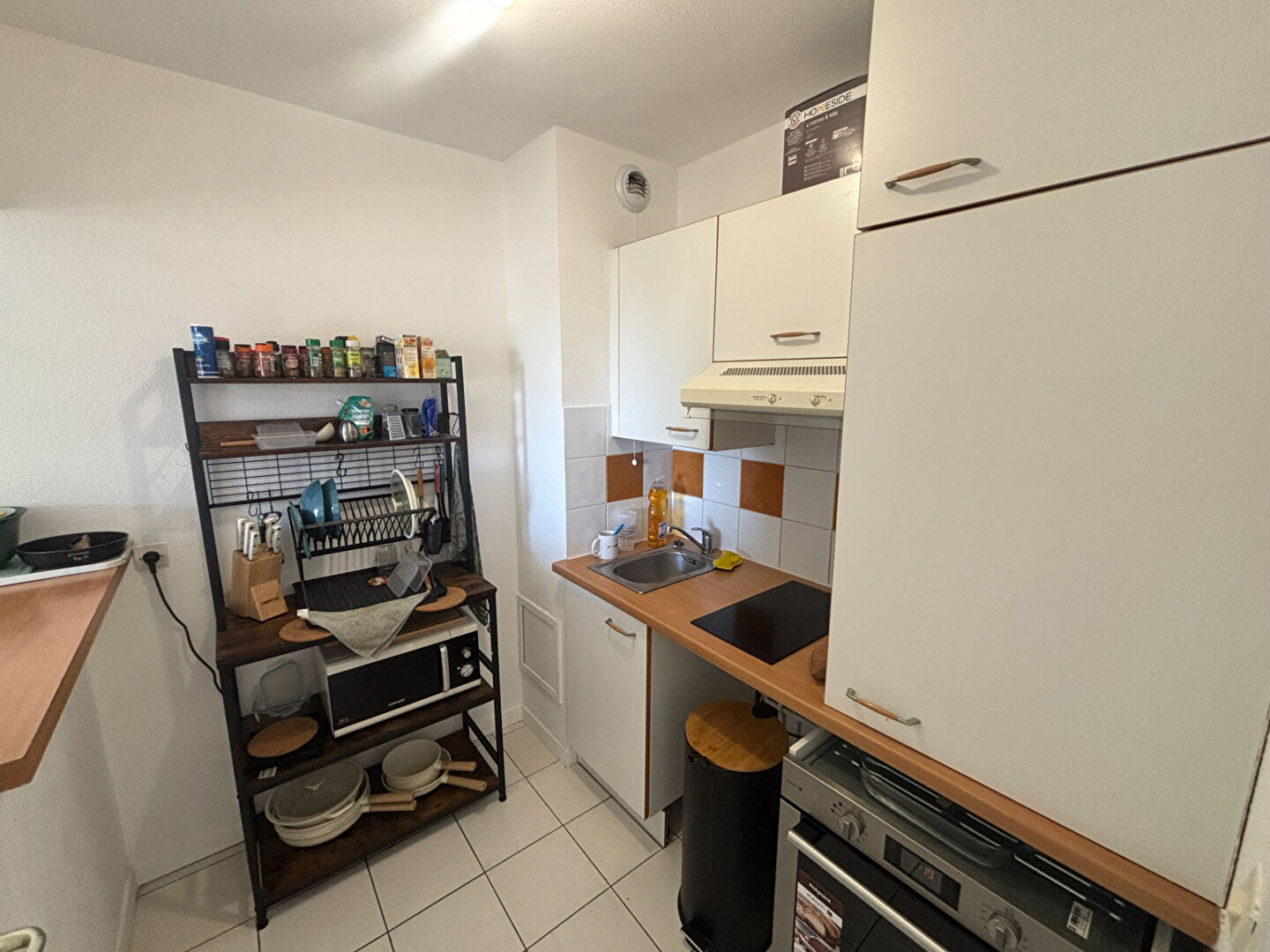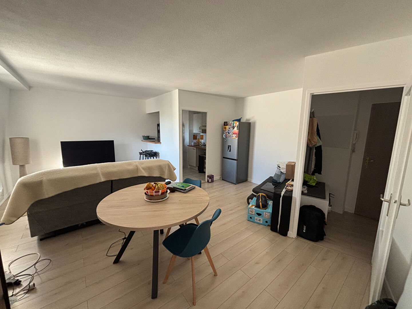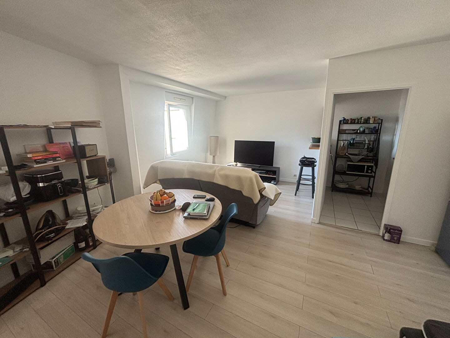 Appartement type 2 au 3eme et dernier étage, comprenant une entrée, un séjour, cuisine aménagée et équipée (plaque, hotte), une chambre, une salle de bains.