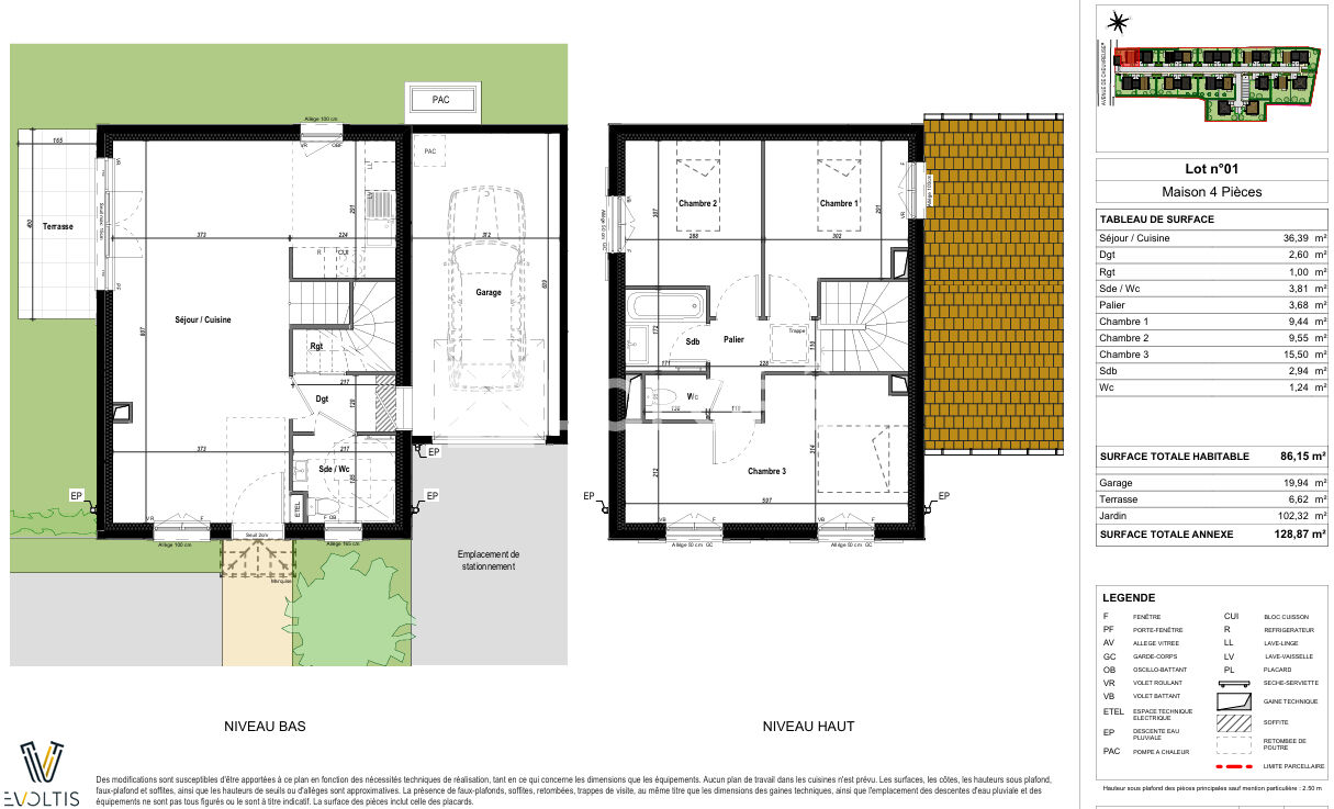 Garage et 2 places de parking. Jardins clôturés, plantés et engazonnés. Pompe à chaleur et des prestations assurant excellente performance énergétique.