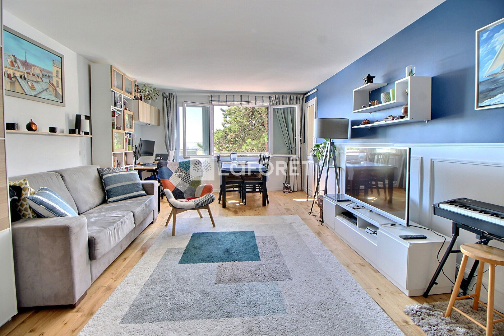 Un séjour de 22 m2 exposé sud ouvrant sur un premier balcon avec vue sur Paris et sur la Tour Eiffel.