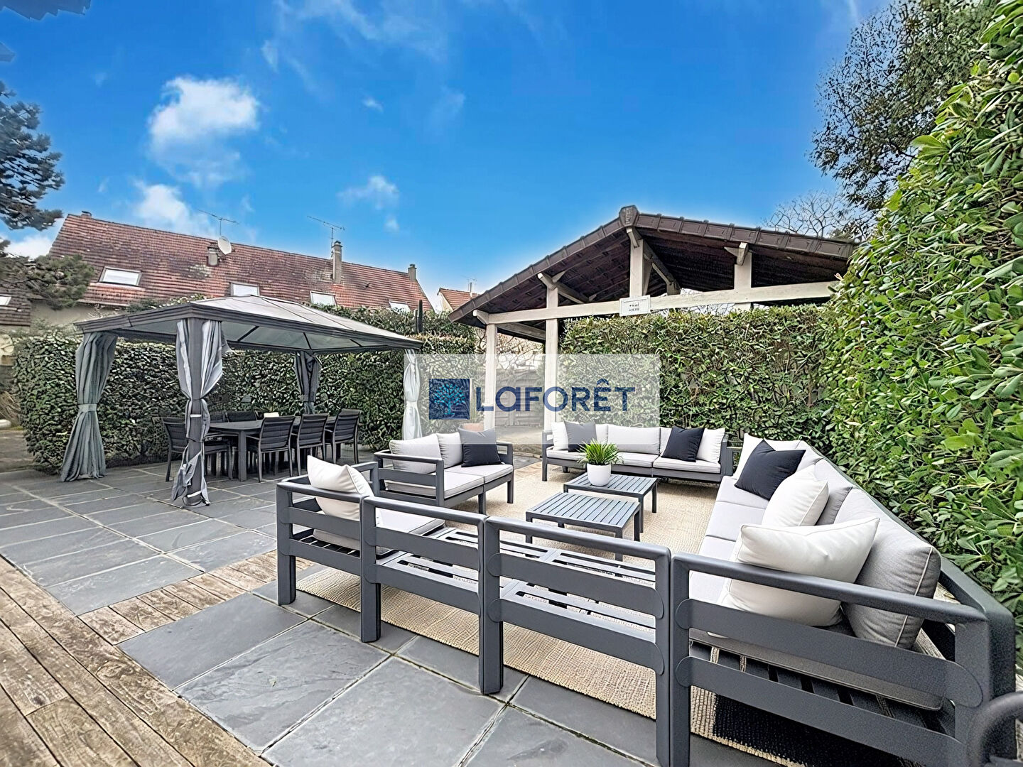 À l'extérieur, le terrain de 806 m² accueille une magnifique piscine chauffée bordée d'une terrasse en teck, un salon de jardin, un auvent ainsi qu'un pool house entièrement aménagé et équipé, créant un véritable espace de vie supplémentaire aux beaux jours. Plusieurs véhicules peuvent être stationnés sur la propriété.