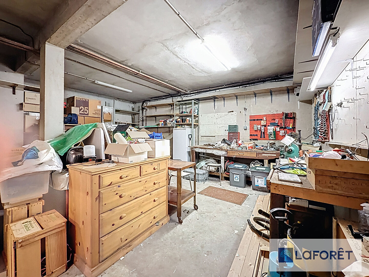 Le sous-sol total se compose d'un vaste atelier, d'un garage et de nombreux espaces de stockage, répondant aux besoins des bricoleurs ou des professionnels.