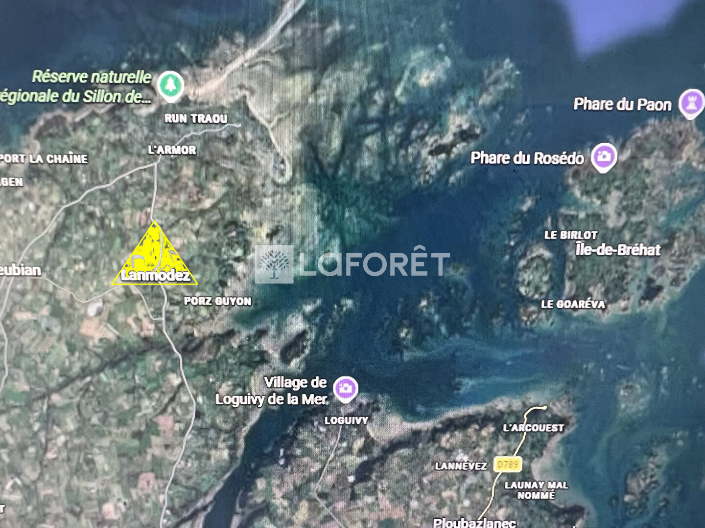 Au bourg de Lanmodez, un terrain d'environ 1622 m² dont 607 m² constructibles hors lotissement et libre de constructeur, borné, non viabilisé. Le terrain est desservi par les réseaux, prévoir un assainissement individuel. Emplacement calme à 1,5km de la mer.