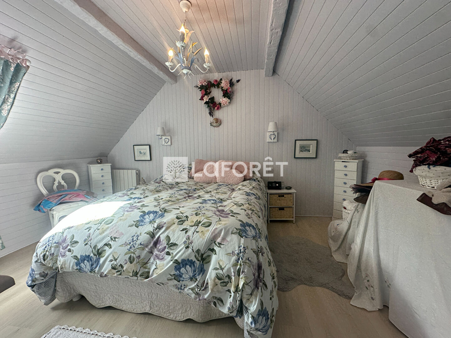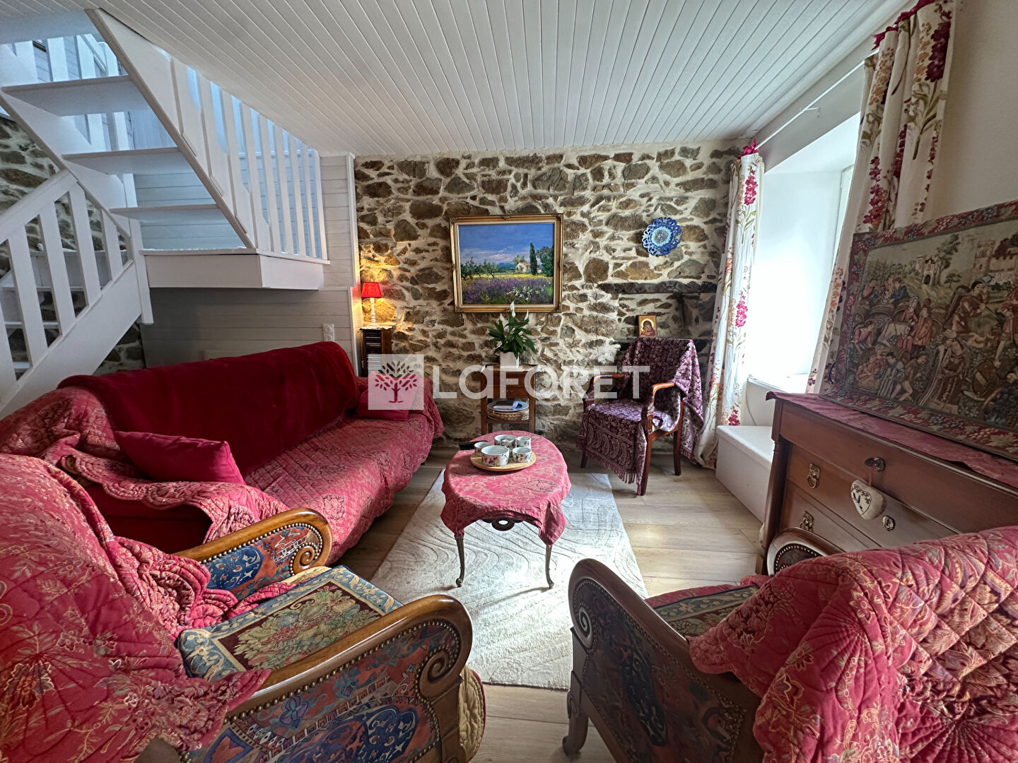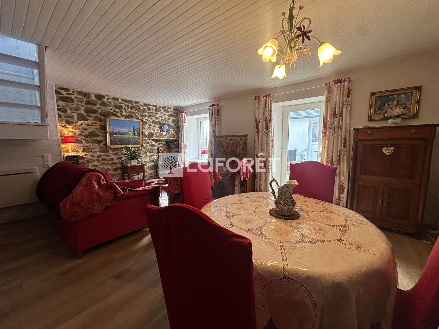 Au rez-de-chaussée, vous découvrirez un séjour chaleureux avec poêle à bois, une cuisine aménagée , ainsi qu'une salle de bains avec WC. À l'étage, un palier dessert deux chambres.