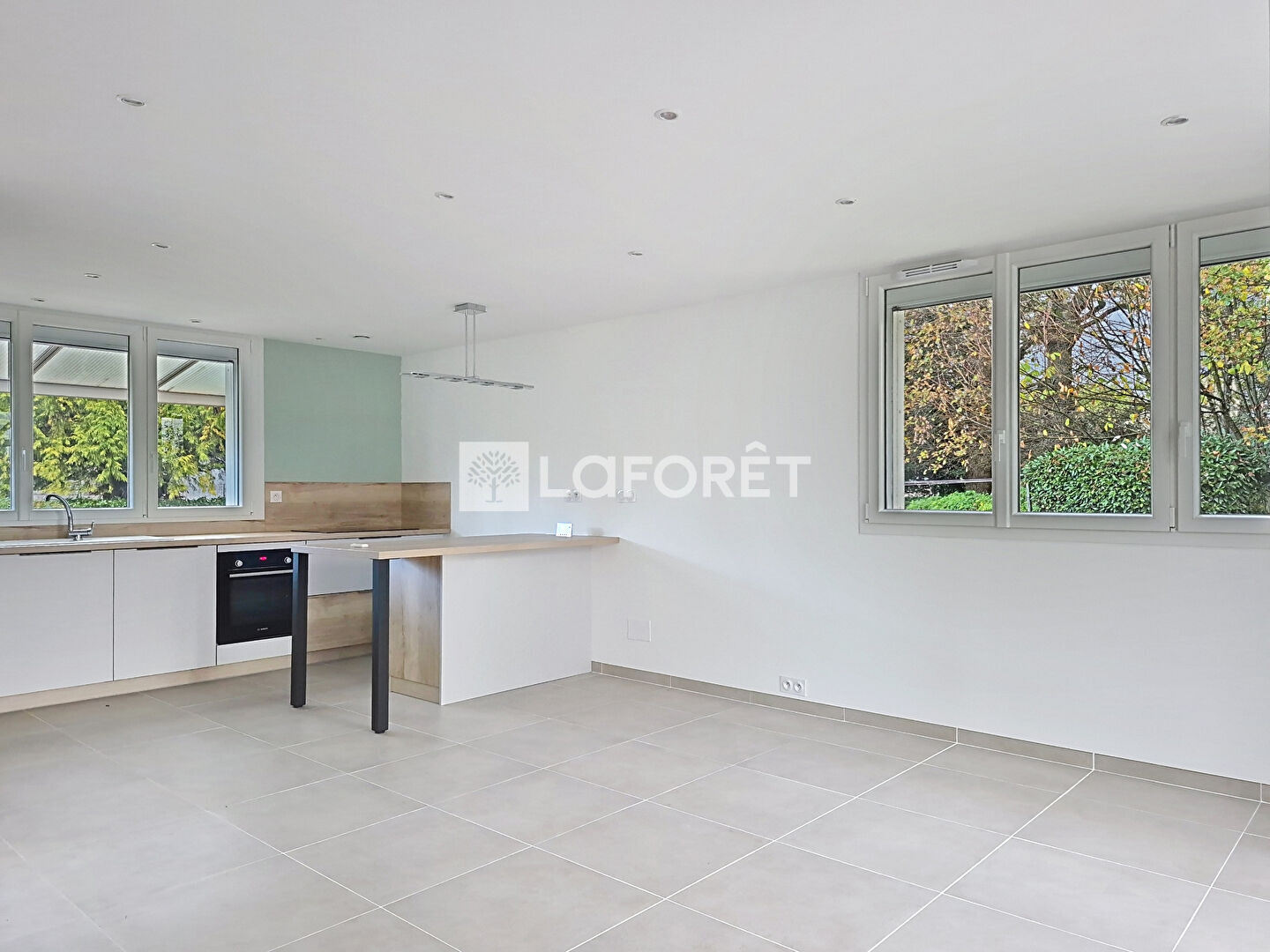 vue sur le jardin, un salon-séjour avec cuisine aménagée et équipée. Une véranda est accessible depuis le