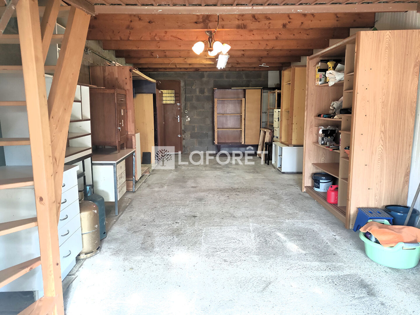 Garage avec pièce aménagée au dessus et plusieurs abris de jardin.