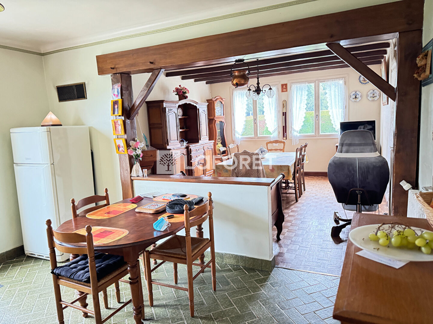 - Au rez-de-chaussée: une entrée, donnant sur un salon, une cuisine ouverte sur le séjour, une salle de bains, une chambre, WC, une chaufferie, une arrière cuisine, véranda.