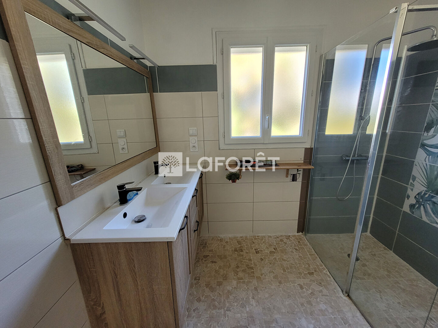 La maison se compose au rez-de-chaussée d'une entrée desservant un salon/séjour lumineux sur parquet avec accès à un balcon, d'une cuisine séparée, aménagée et équipée, de deux chambres, d'une salle d'eau entièrement rénovée avec douche à l'italienne et double vasque, ainsi que de WC indépendants.