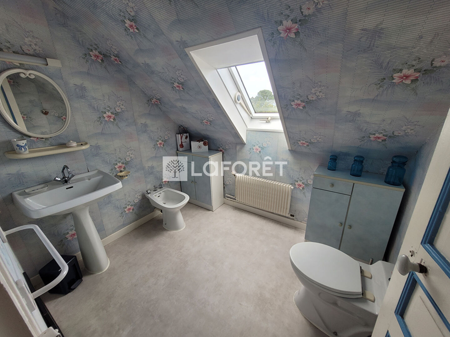 - Au premier étage : deux chambres (dont une avec un grand placard), une pièce d'eau avec lavabo et WC sanibroyeur (possibilité d'y installer une douche).