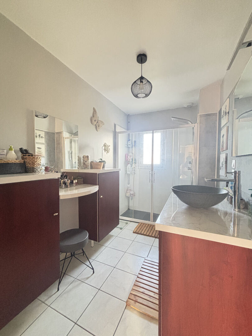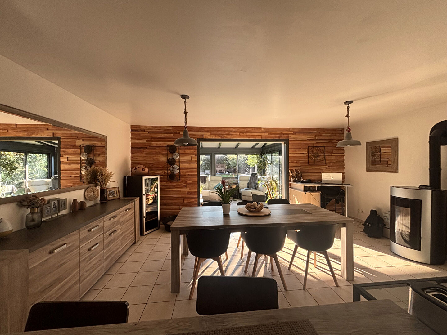 Elle offre au rez-de-chaussée, entrée avec placard, double séjour très lumineux (agrandissement de 2015) avec accès à la terrasse, cuisine ouverte, chambre avec salle d'eau , cellier et WC.