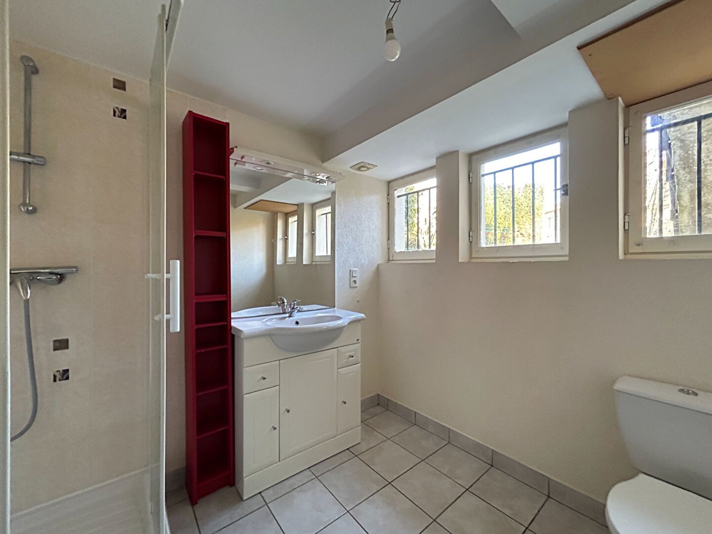 Au rez-de-jardin : 2 chambres avec placards, une salle d'eau avec douche, vasque sur meuble et wc.
