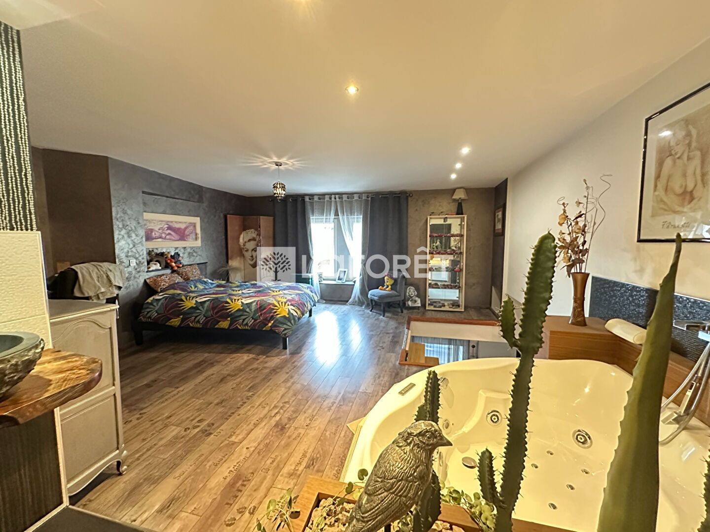 A l'étage coup de coeur assuré pour la vaste suite parentale de 30 m² avec dressing, coin bureau, baignoire balnéo, douche et wc.