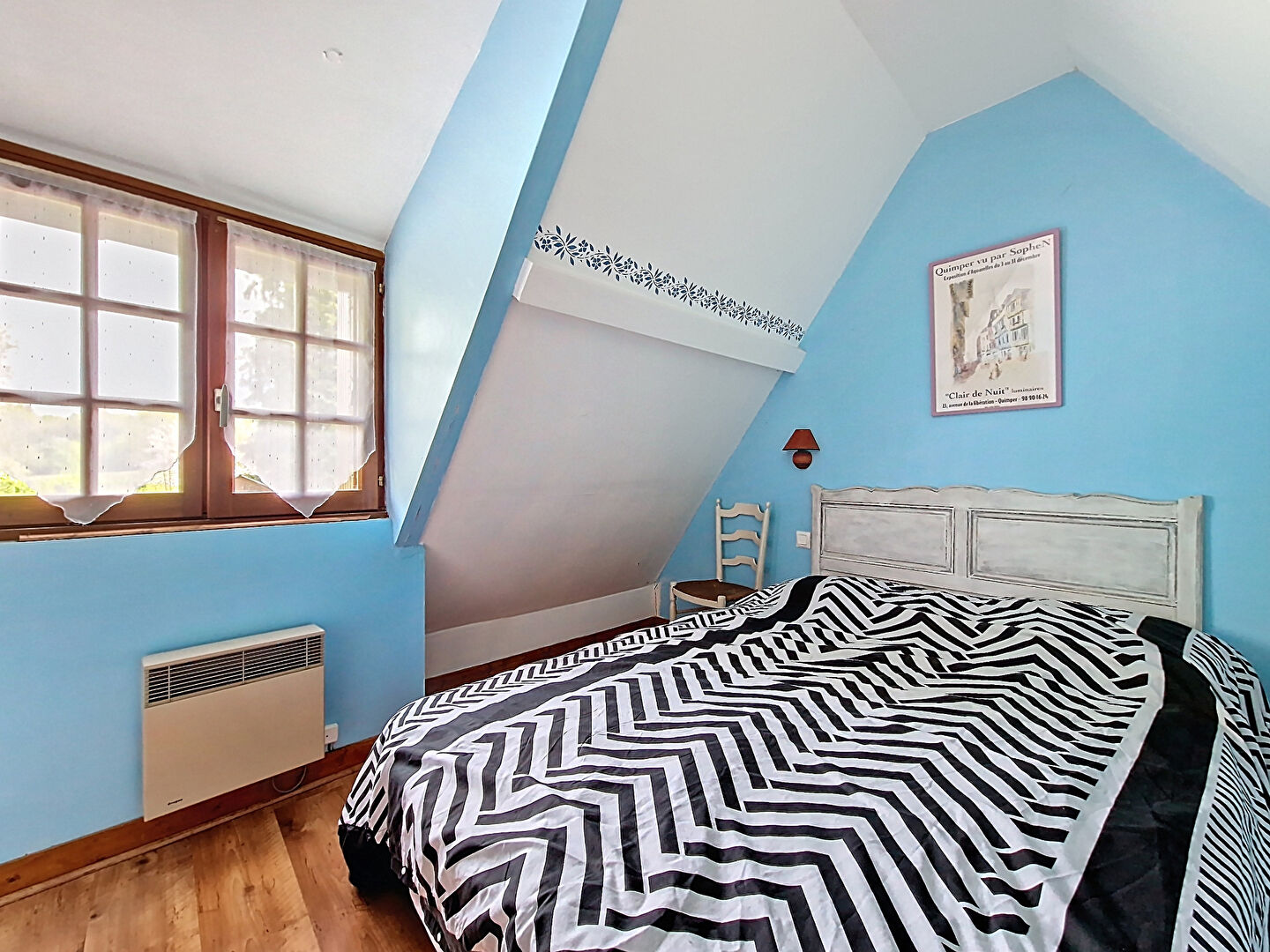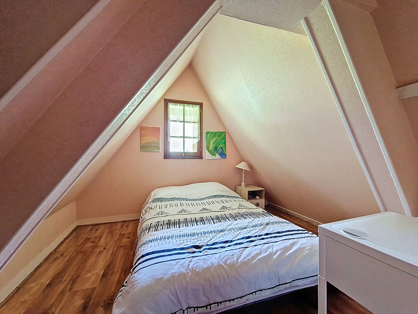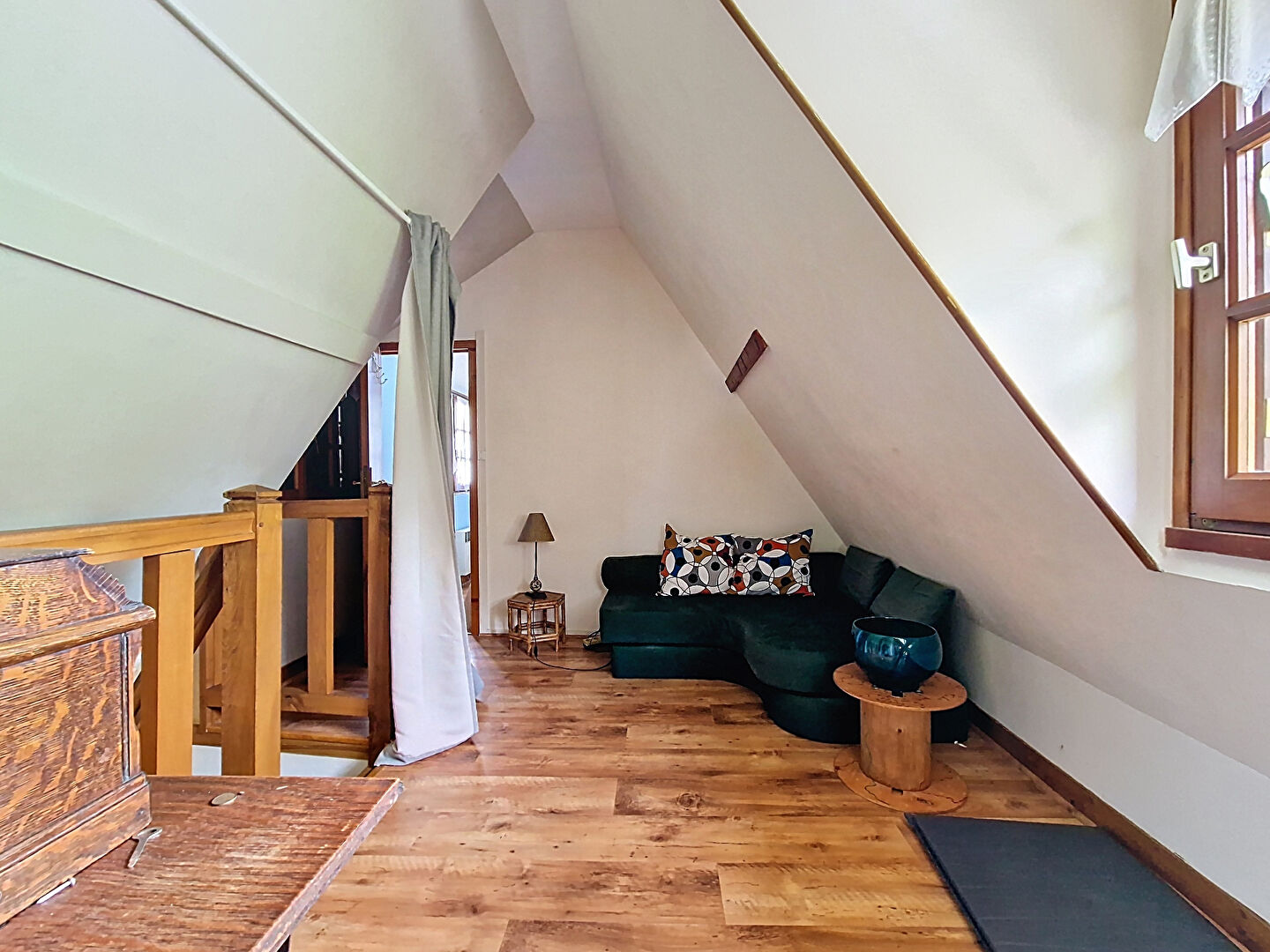 L'étage propose une grande pièce palière desservant deux chambres mansardées, ainsi qu'une salle d'eau avec wc.