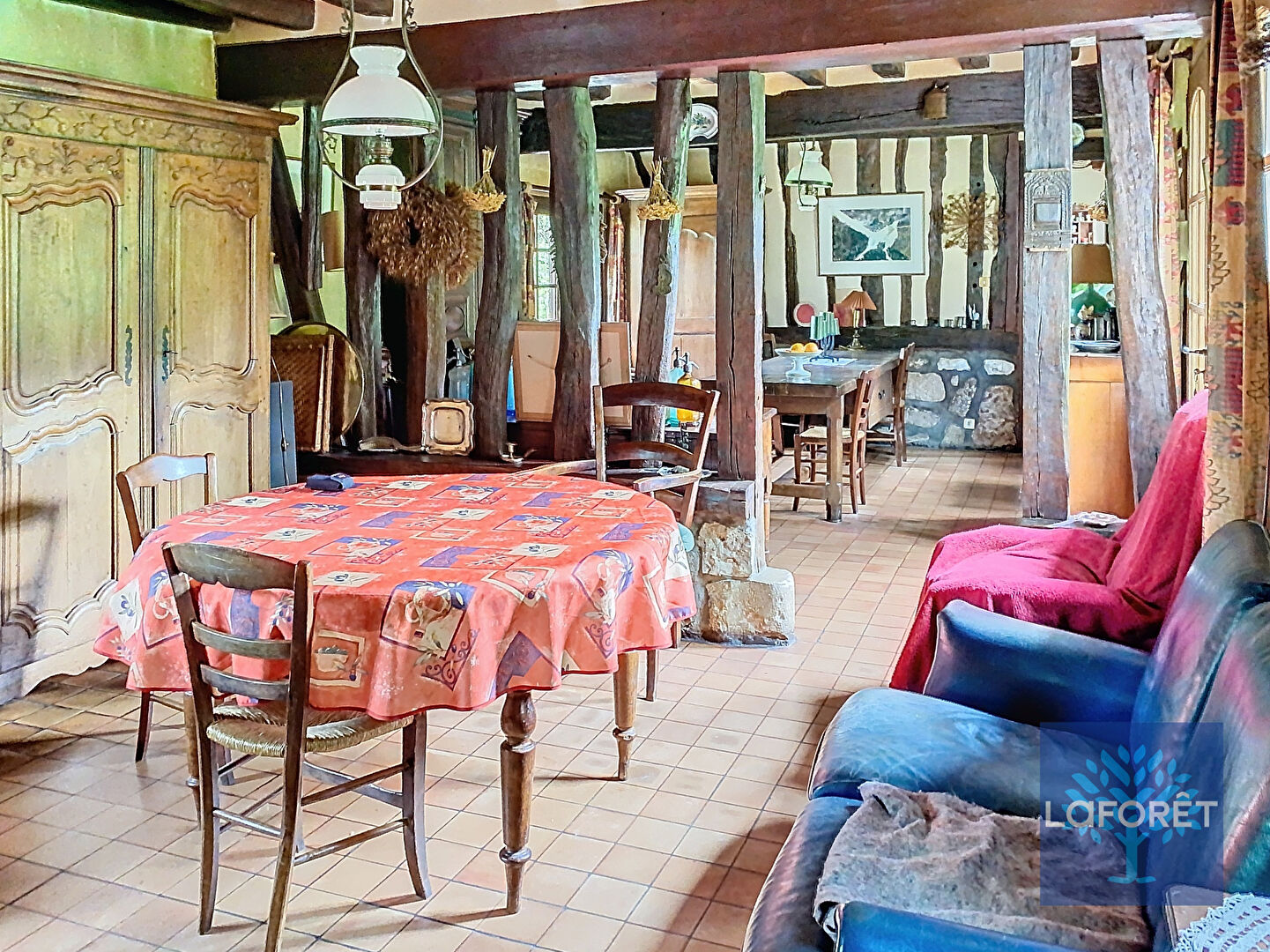 Une grande chaumière avec un grand séjour avec cheminée, une cuisine aménagée, une salle de douche et une chambre au rez-de-chaussée.
