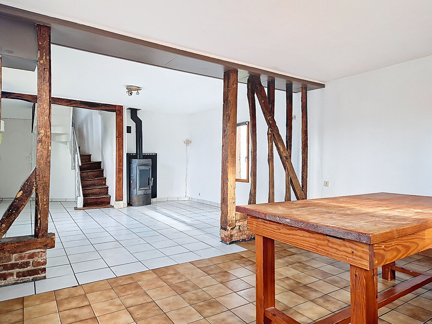 Vous trouverez au rez-de-chaussée : Une cuisine ouverte sur un séjour baigné de lumière avec un poêle à bois pour créer une ambiance chaleureuse durant les soirées d'hiver.