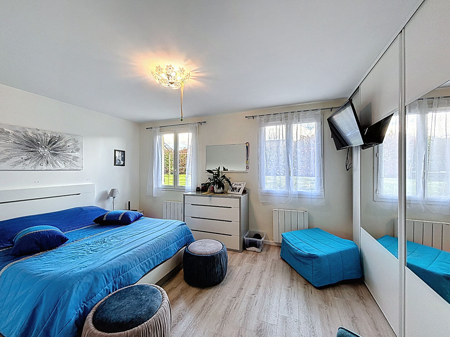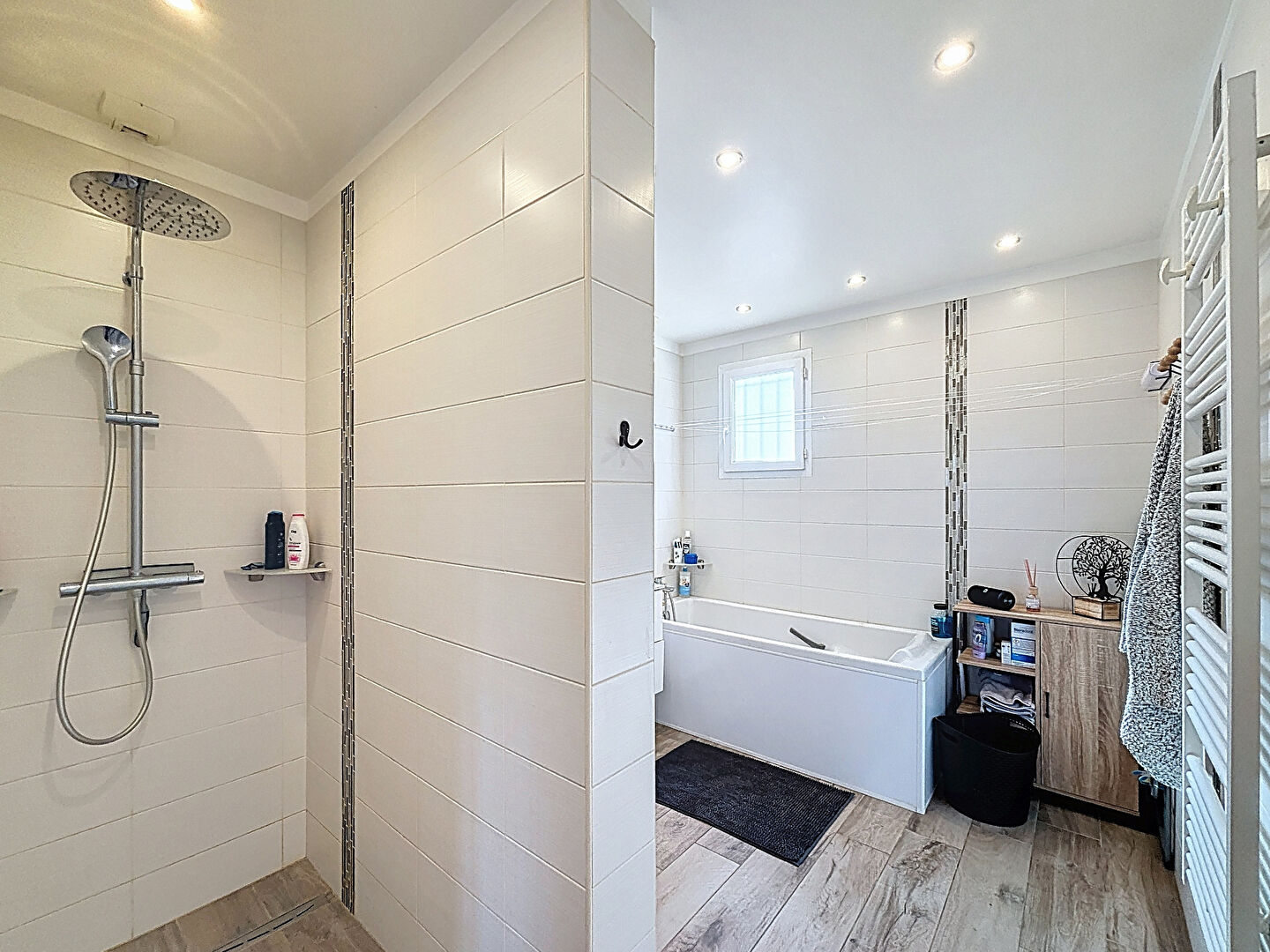 Côté nuit, vous trouverez 3 chambres dont une avec dressing, ainsi qu'une grande salle de bains avec douche, baignoire et WC.