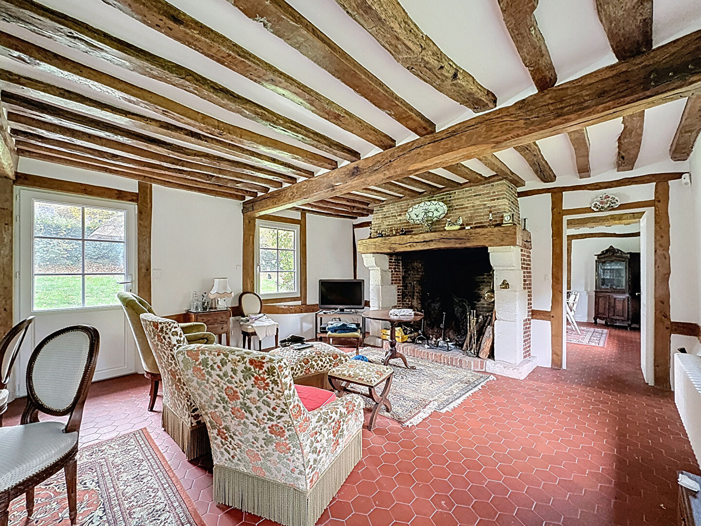Au rez-de-chaussée : séjour, avec cheminée ouverte, salon, une chambre, wc, dégagement, cuisine, salle de bains.