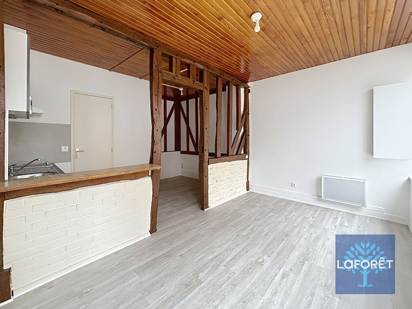 Il comprend une pièce de vie, mise en valeur par de beaux colombages, qui offrent une séparation avec le coin cuisine fonctionnel et parfaitement aménagé.
