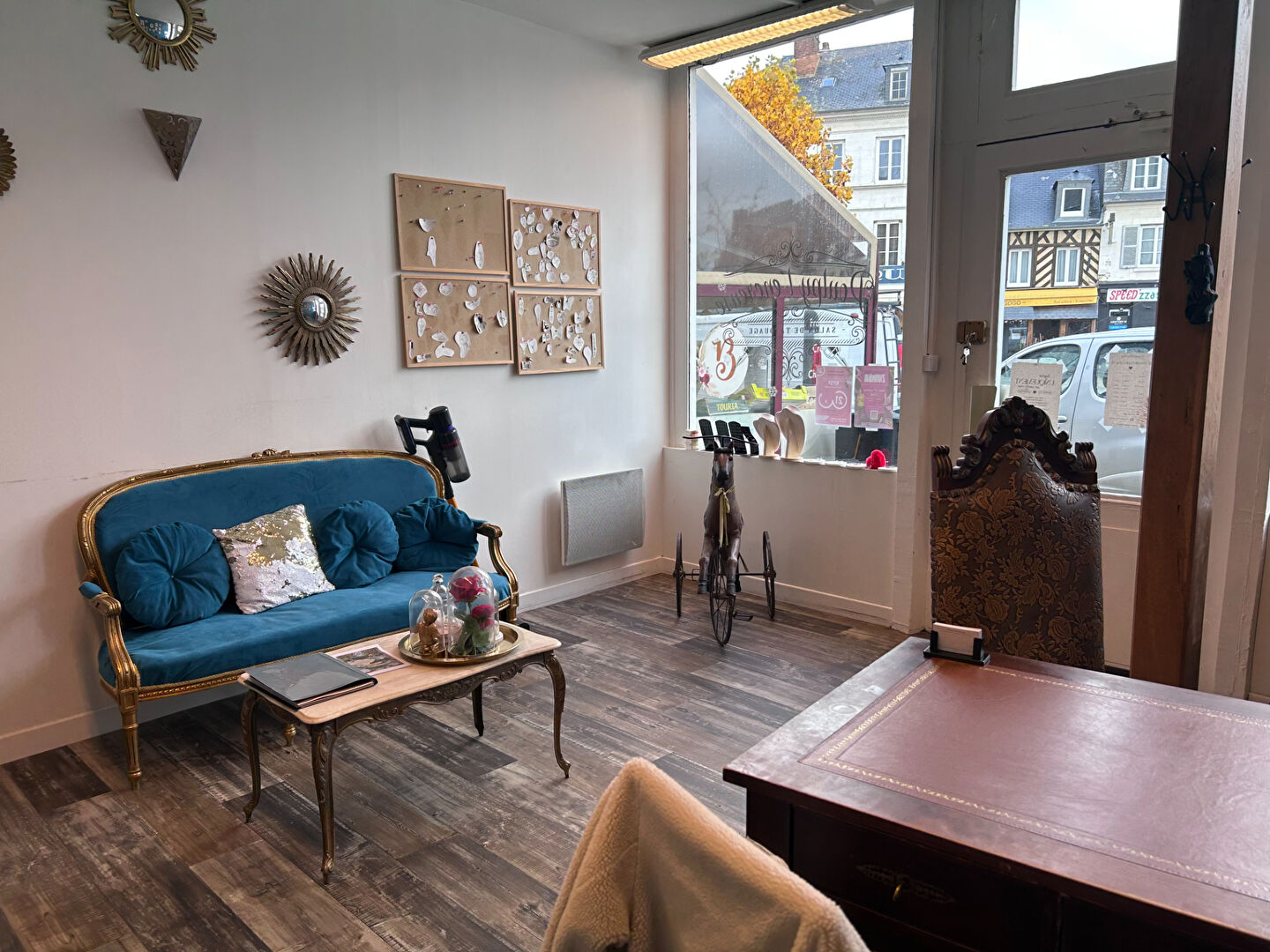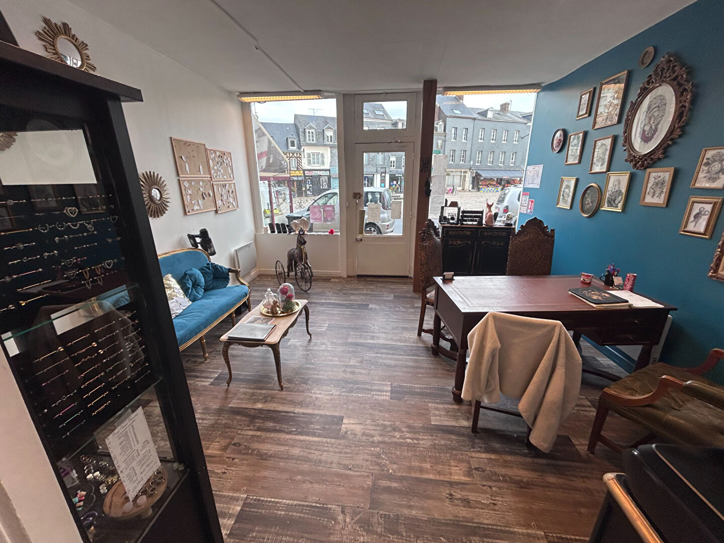 Vitrine en façade, pièce principale spacieuse et lumineuse, une seconde pièce avec lavabo et WC.