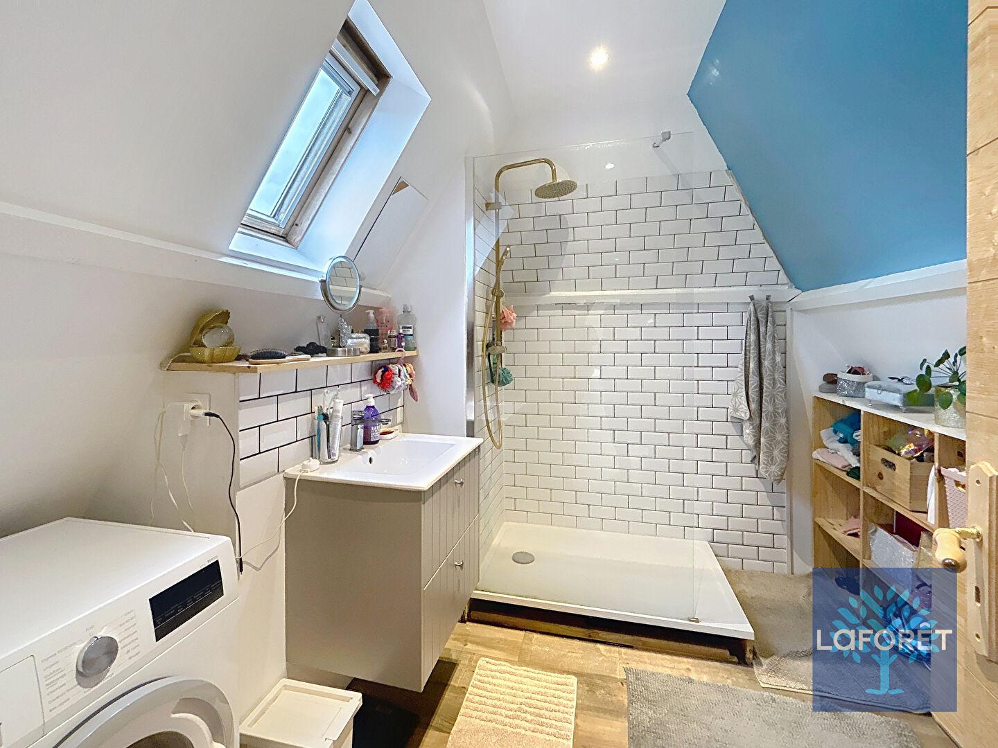 À l'étage, vous trouverez : un palier, une chambre, une salle de douches.