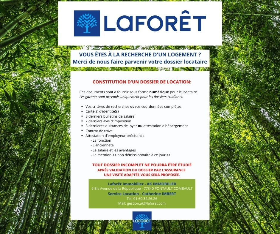 Nous vous invitons à déposer votre dossier sur le site de Laforêt Pontault. Aucune visite ne sera organisée sans dossier complet. Toute demande sans dépôt de dossier ne pourra être traitée. En cas de difficulté, merci de contacter le service location de l'agence.