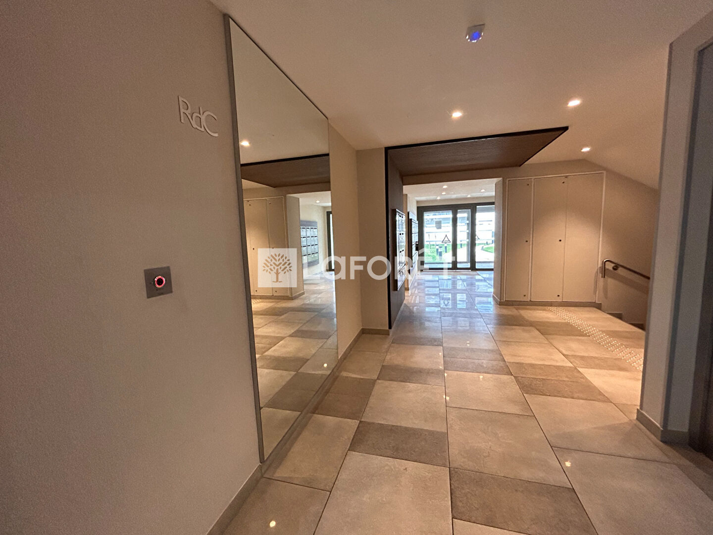 dégagement à gauche à la sortie de l'ascenseur. Il se compose : d'une entrée, un séjour avec cuisine ouverte