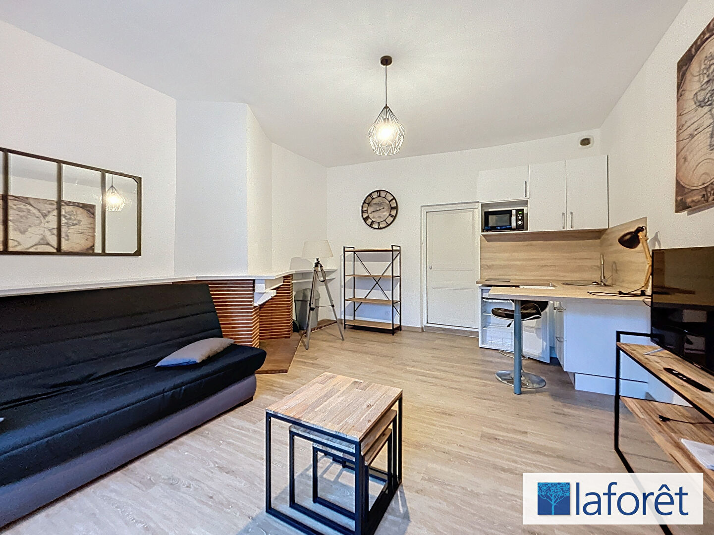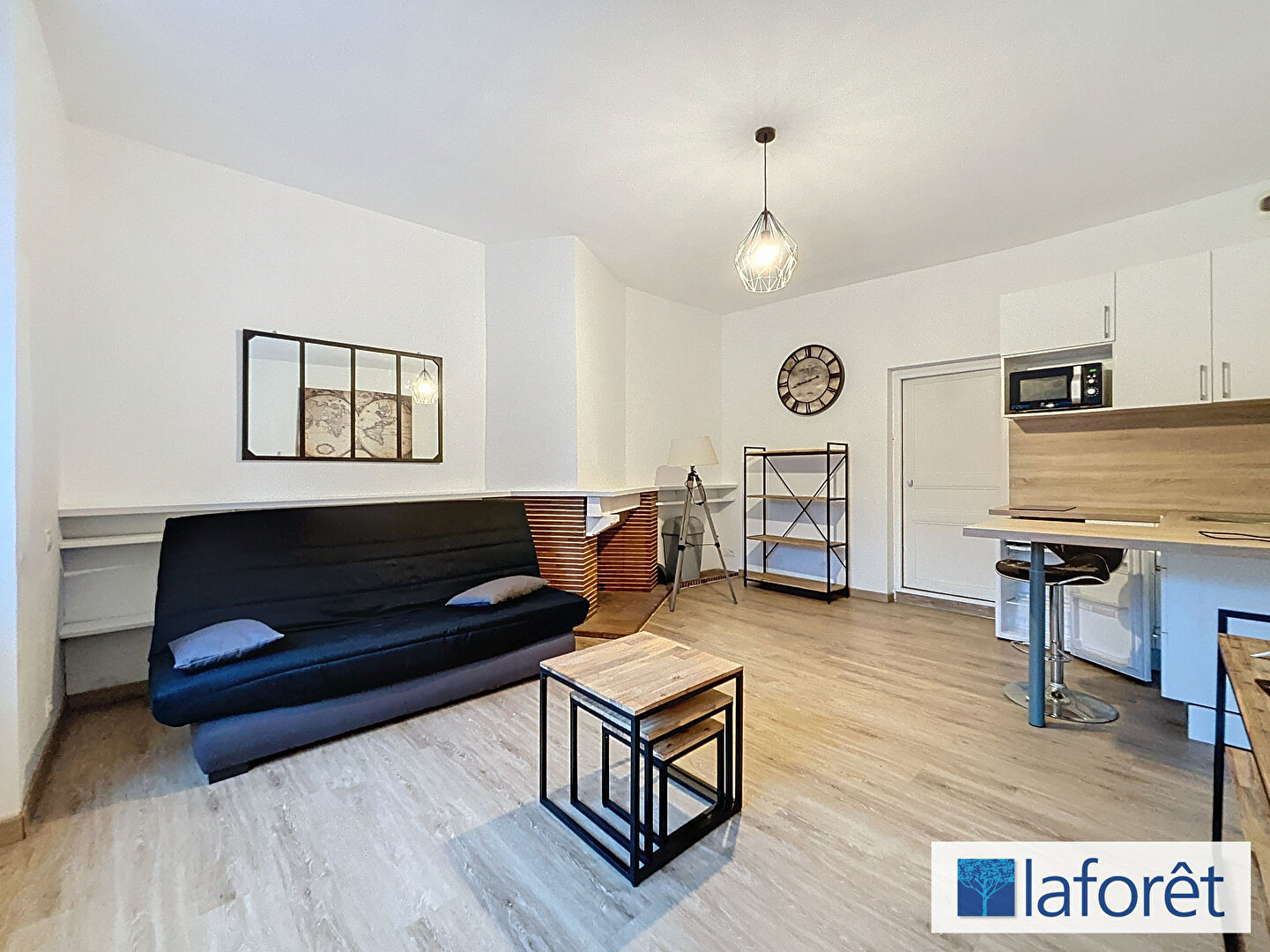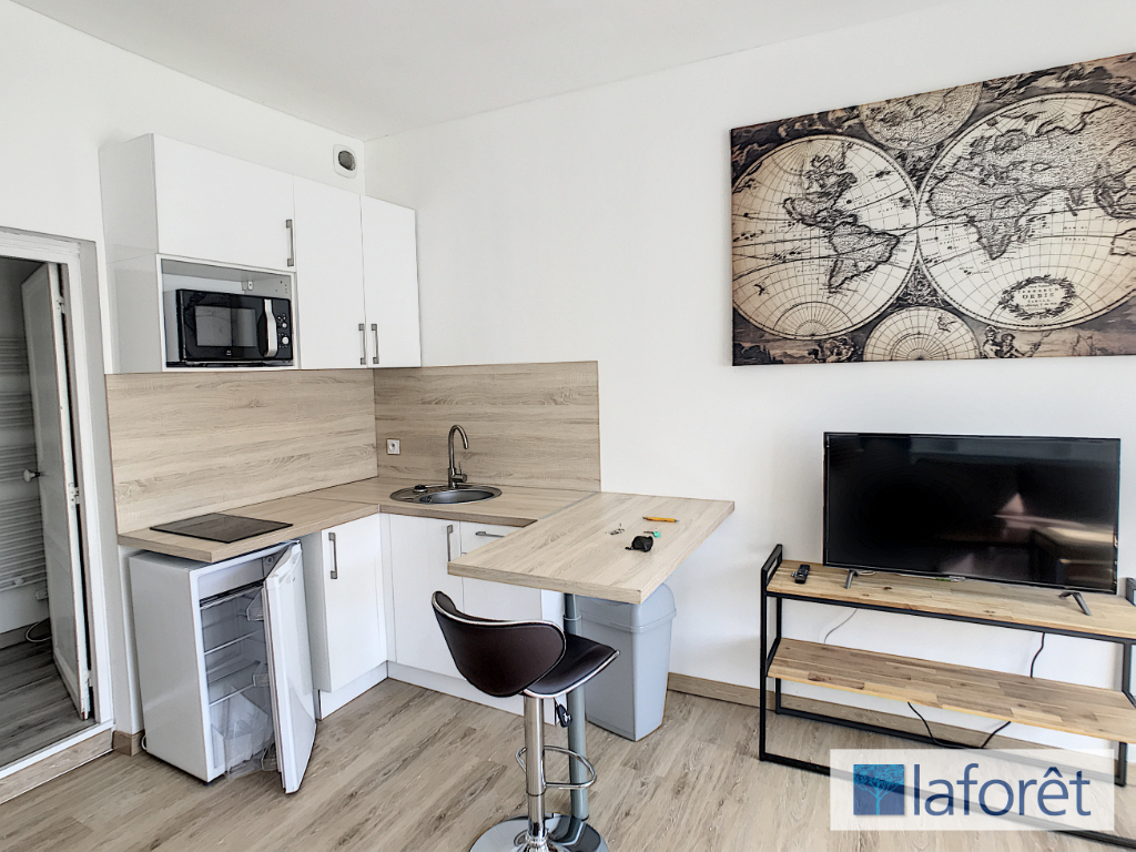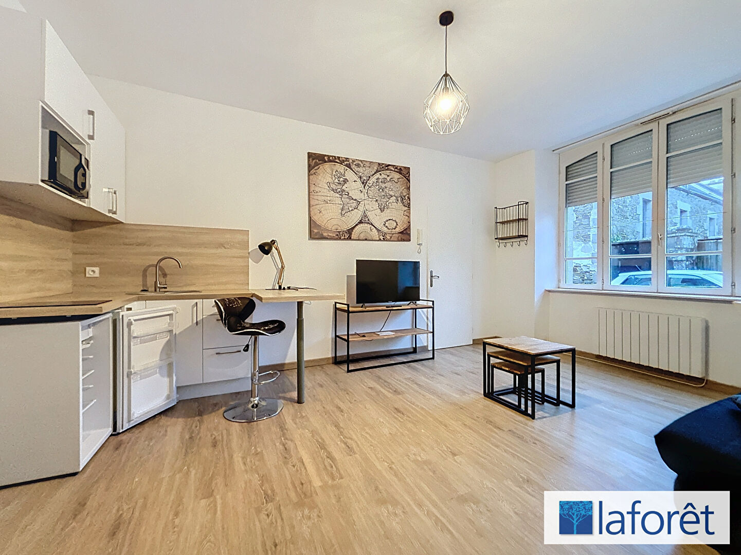 En plein bourg de Noyal-Pontivy, studio meublé en rez-de-chaussée, avec cuisine aménagée et équipée, et salle d'eau avec wc.