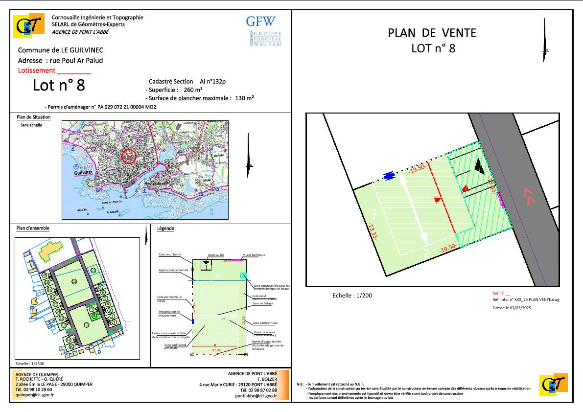 GUILVINEC - A proximité des commerces, du port et de la plage. Venez découvrir ce terrain en lotissement de 260m2 (lot n°8), livrable entre Juin et Septembre 2025. Le terrain sera viabilisé et raccordable au tout-à-l'égout.