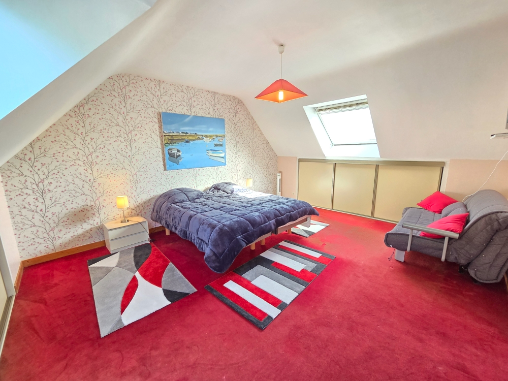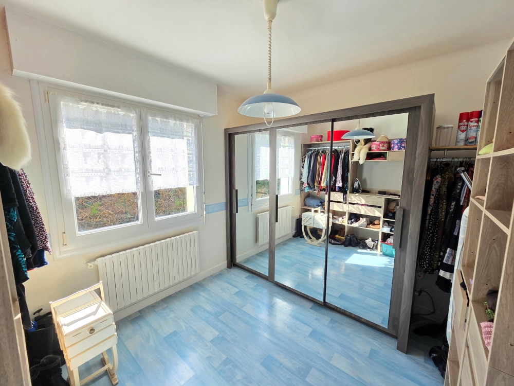 À l'étage, vous profiterez de deux grandes chambres avec placards, d'une salle d'eau avec WC, d'un dressing ainsi que de nombreux rangements.