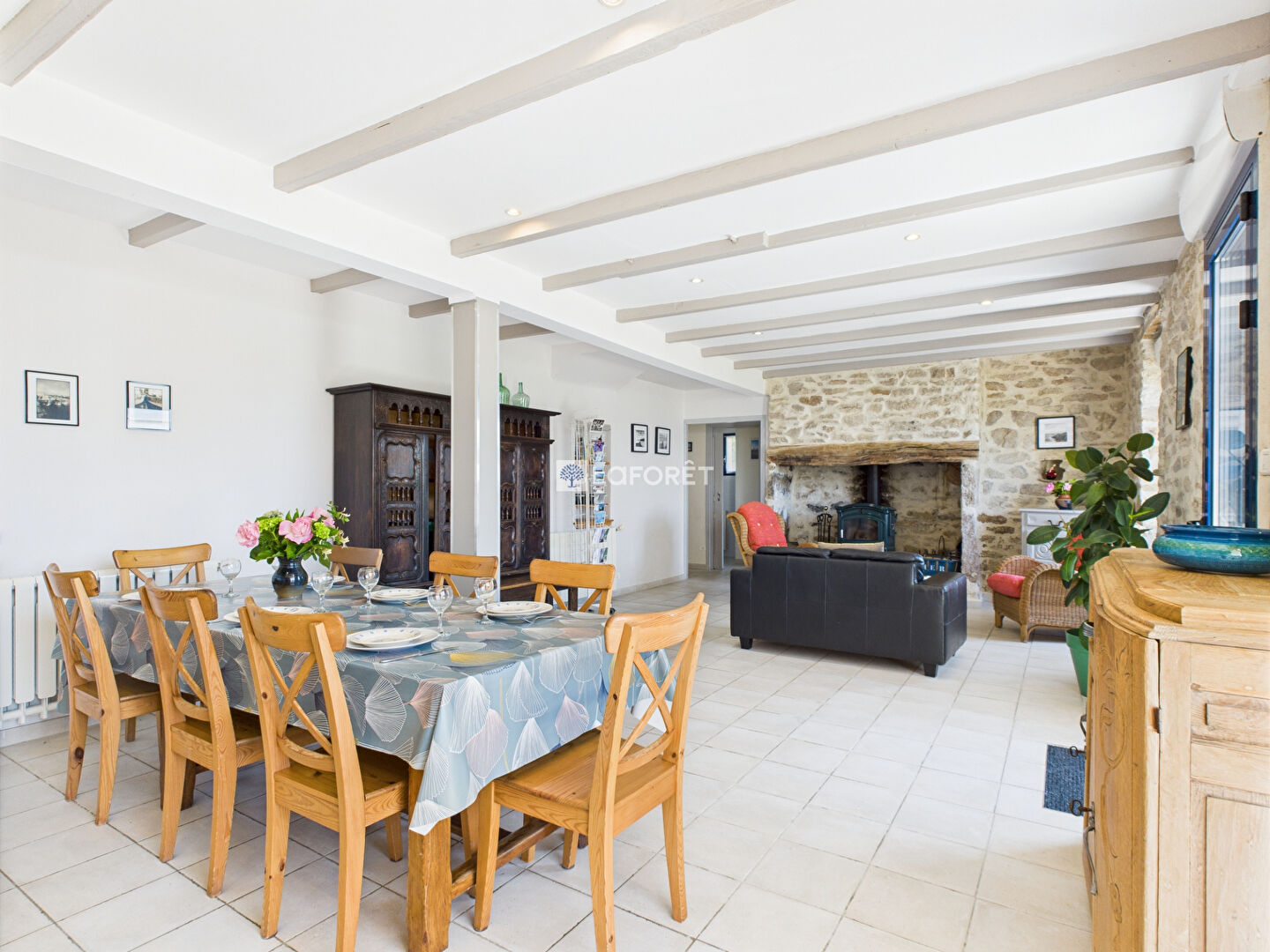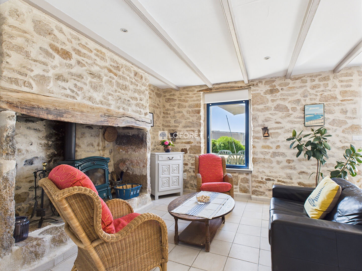 - Le salon avec ses murs de pierres et son ancienne cheminée agrémentée d'un poêle à bois
