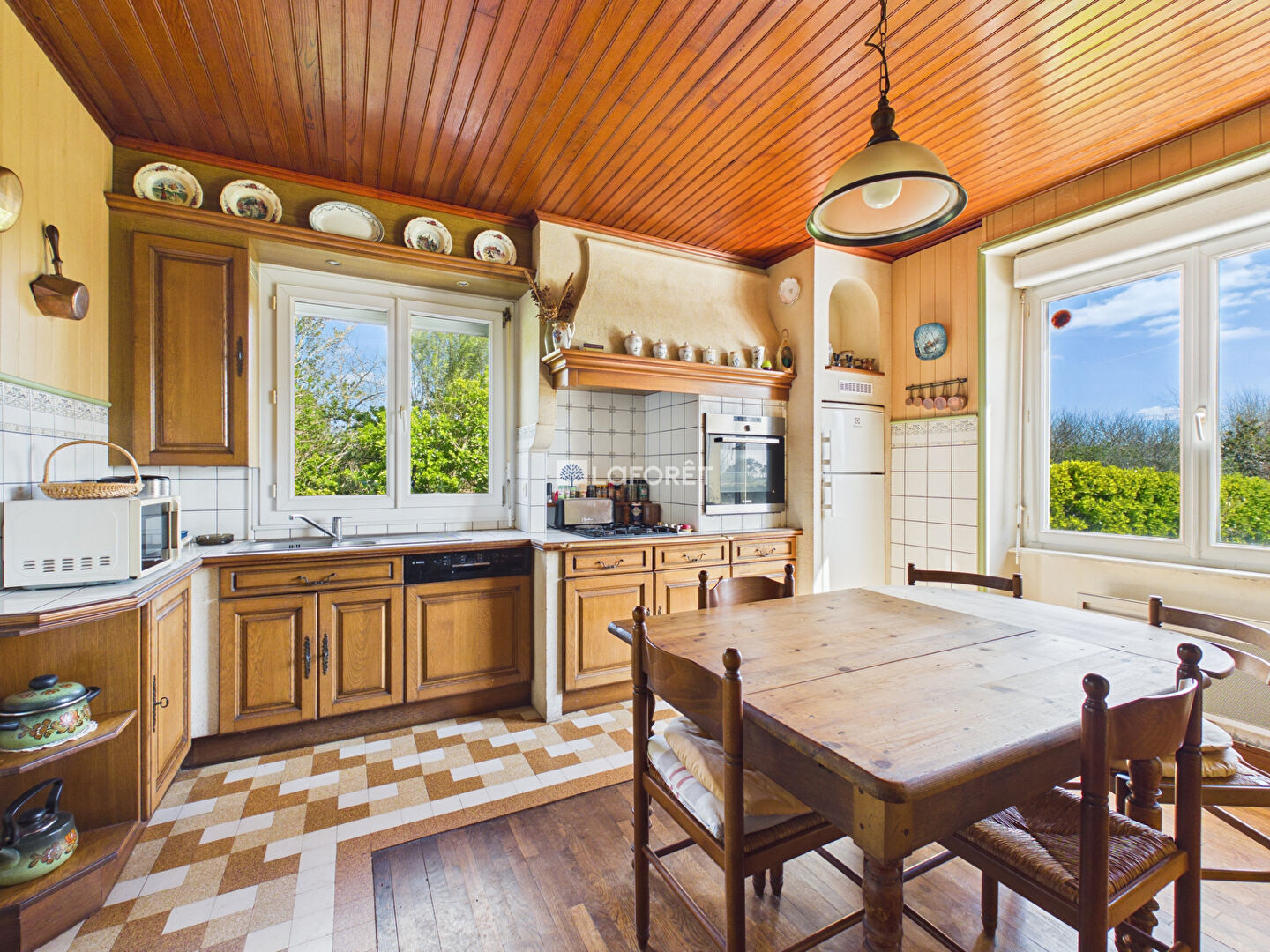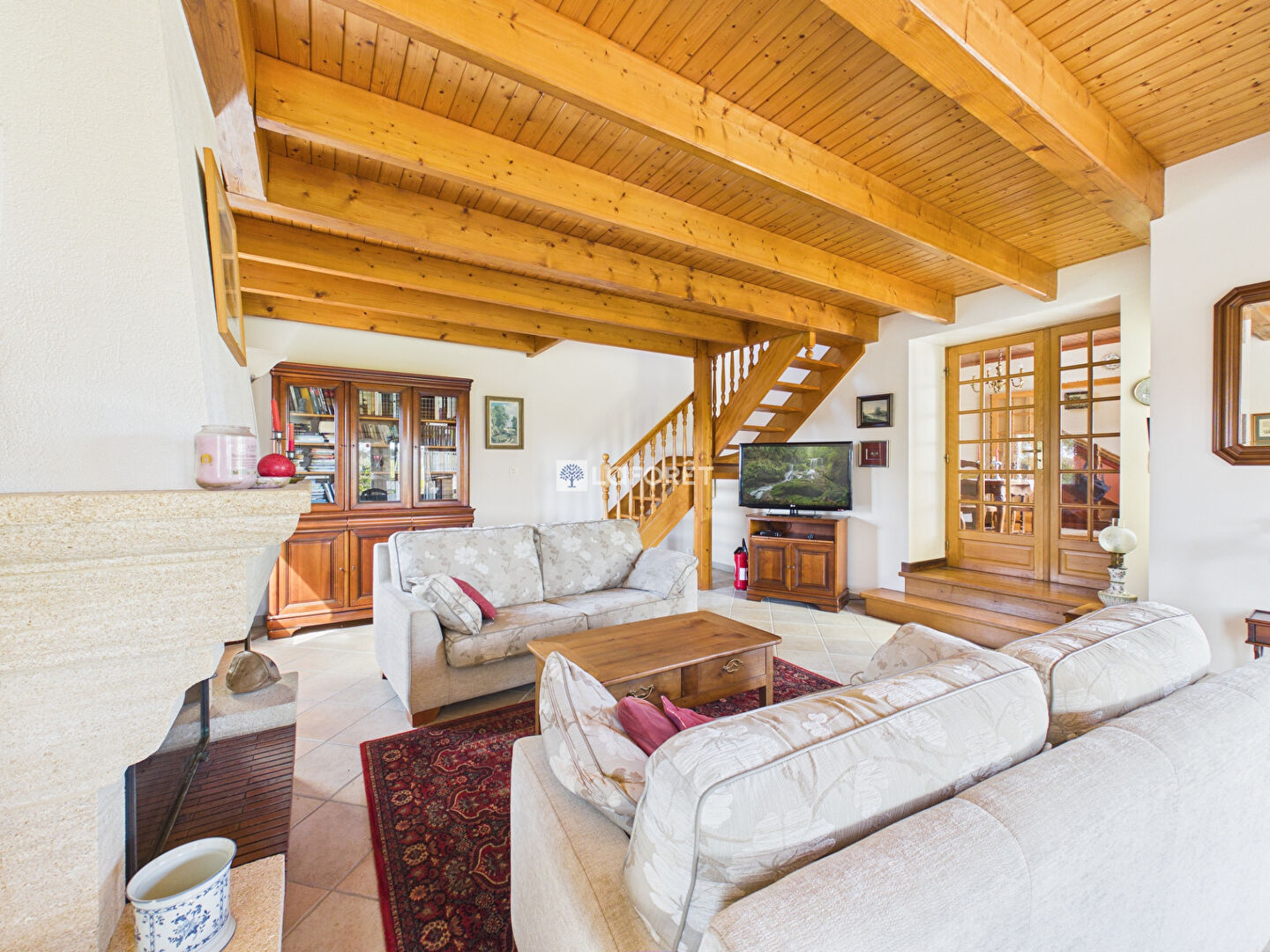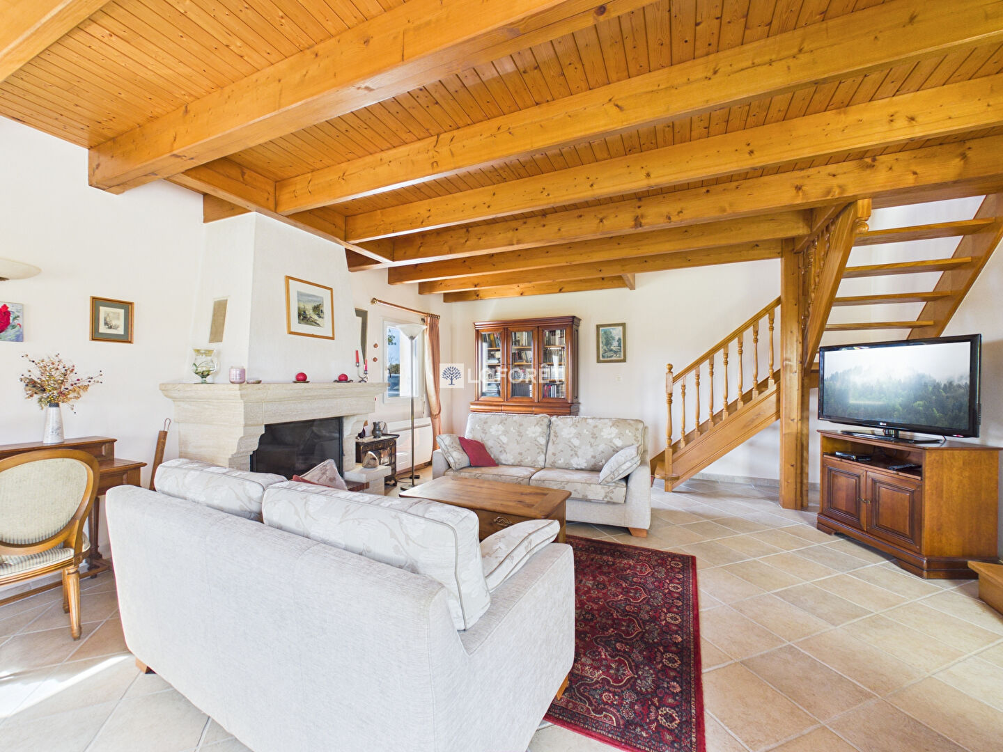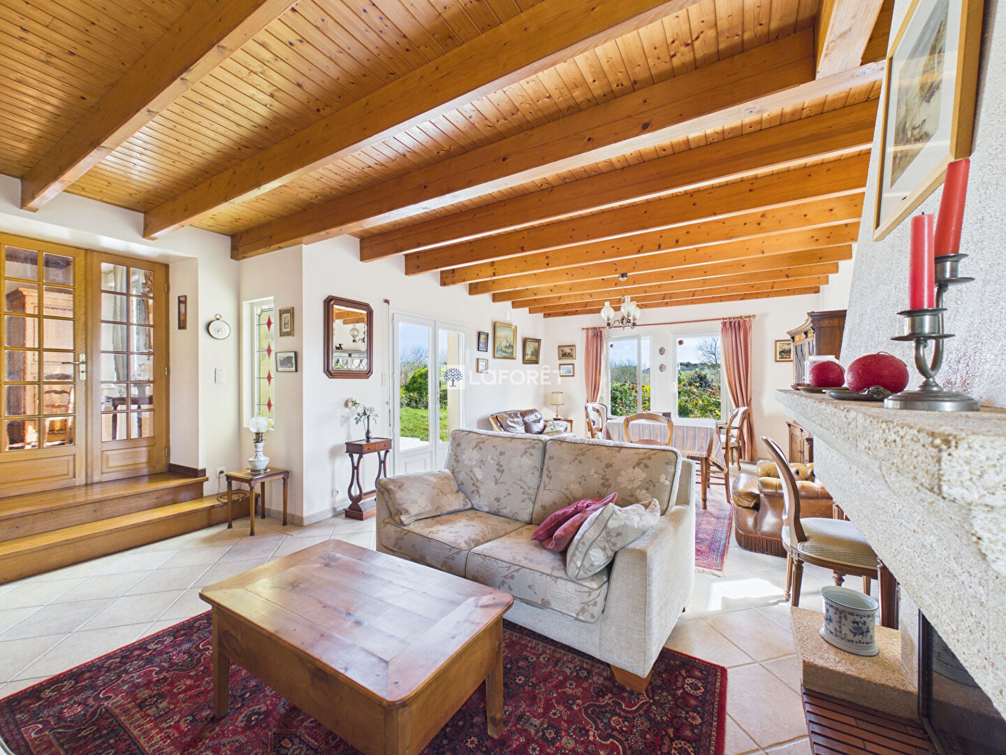 Elle se compose d'une agréable salle à manger, d'un spacieux salon baigné de lumière avec cheminée insert, ainsi que d'une cuisine aménagée et fonctionnelle.