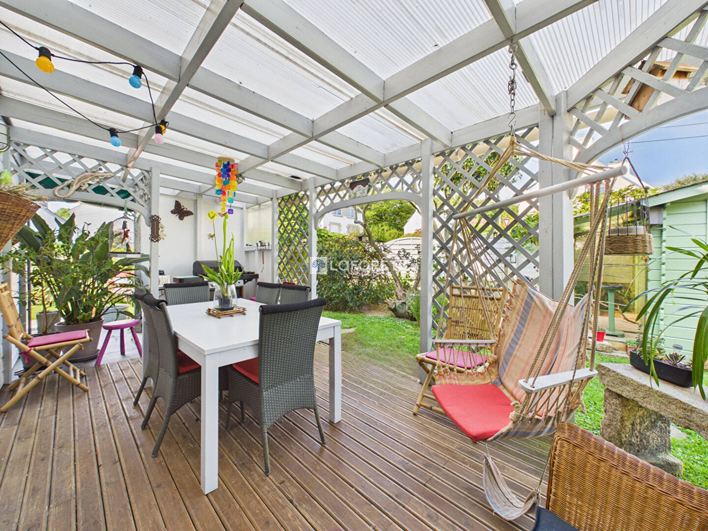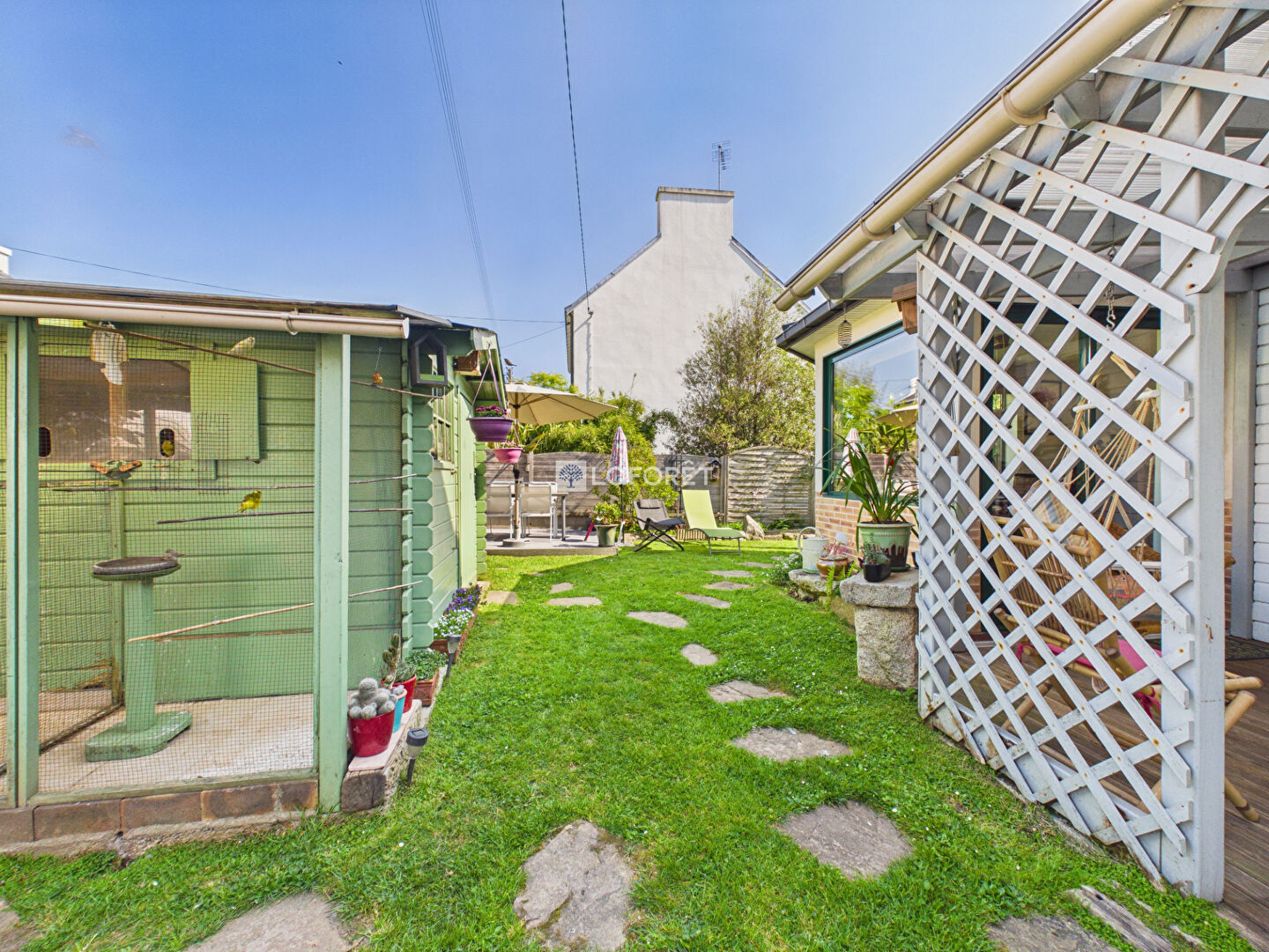Côté extérieur, vous bénéficierez d'un grand garage, d'un appenti, d'une volière, ainsi que d'un magnifique jardin clos d'environ 480 m², parfait pour profiter en toute tranquillité.