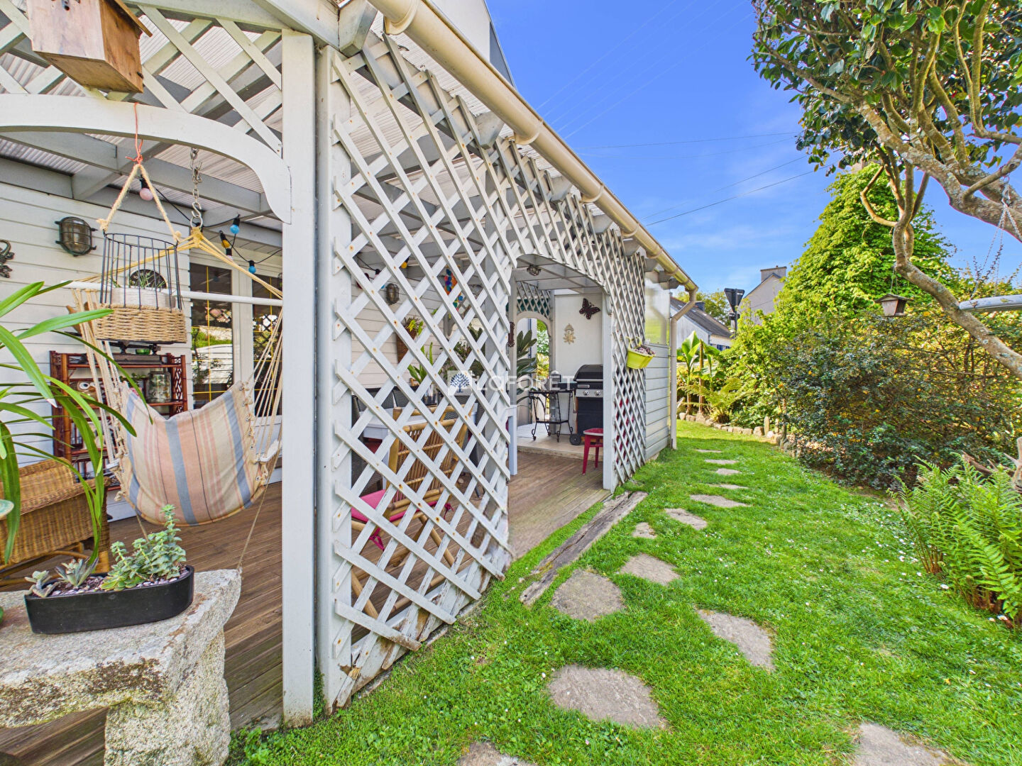Elle se compose d'une spacieuse pièce de vie baignée de lumière, ouverte sur une agréable pergola, idéale pour vos moments de détente. Vous trouverez également une cuisine aménagée et équipée ainsi qu'un WC au rez-de-chaussée.