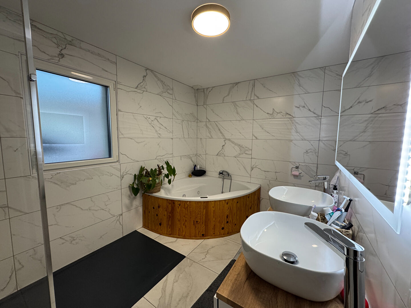 La maison dispose d'une chambre principale avec salle de bains équipée d'une baignoire balnéo, d'une douche et de WC.