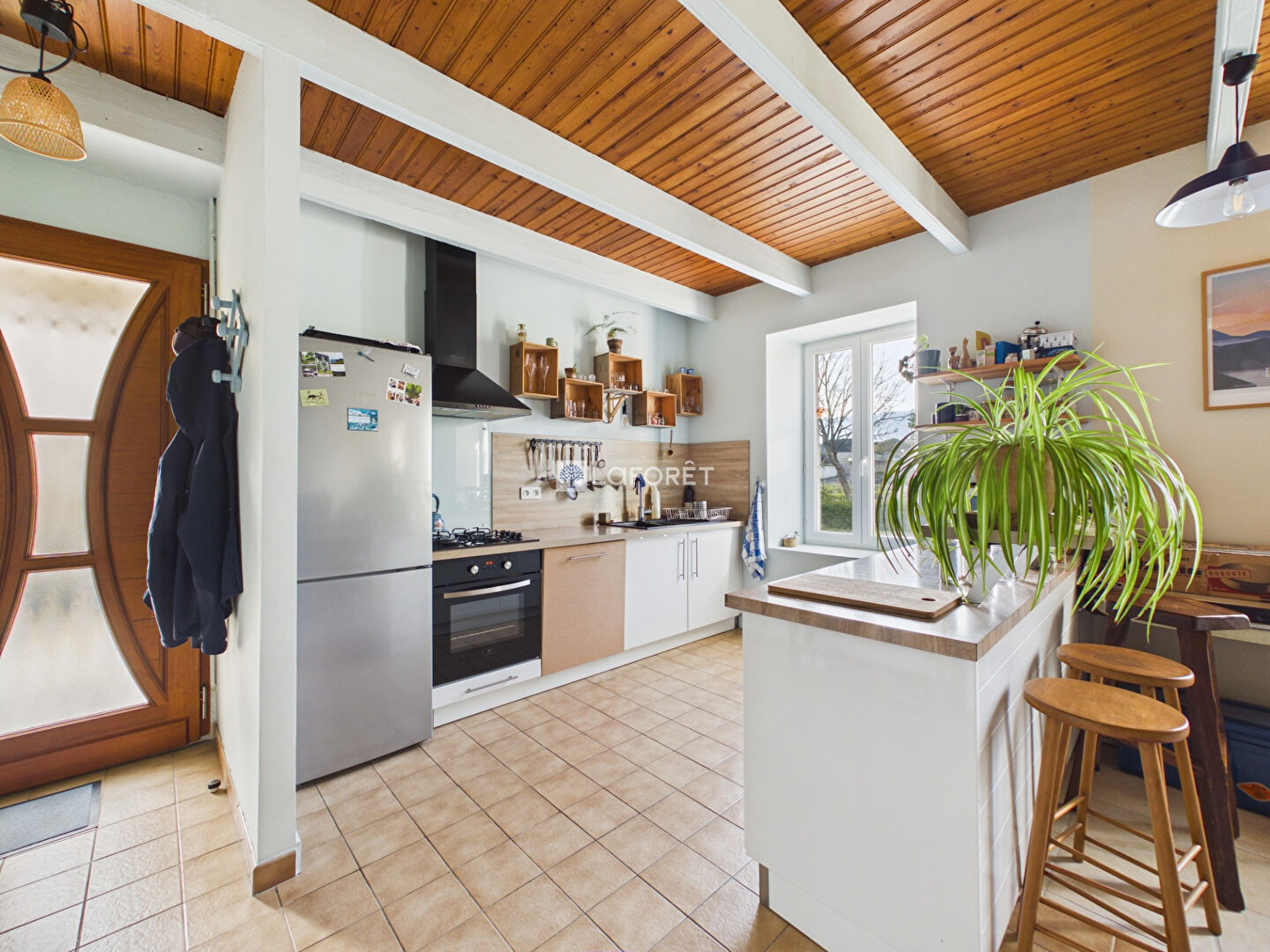 Le rez-de-chaussée comprend une pièce de vie avec cuisine ouverte (40 m²), une chambre, une salle d'eau et un WC. À l'étage : une chambre, un bureau (7 m²) pouvant faire office de chambre, une salle d'eau et un WC indépendant.