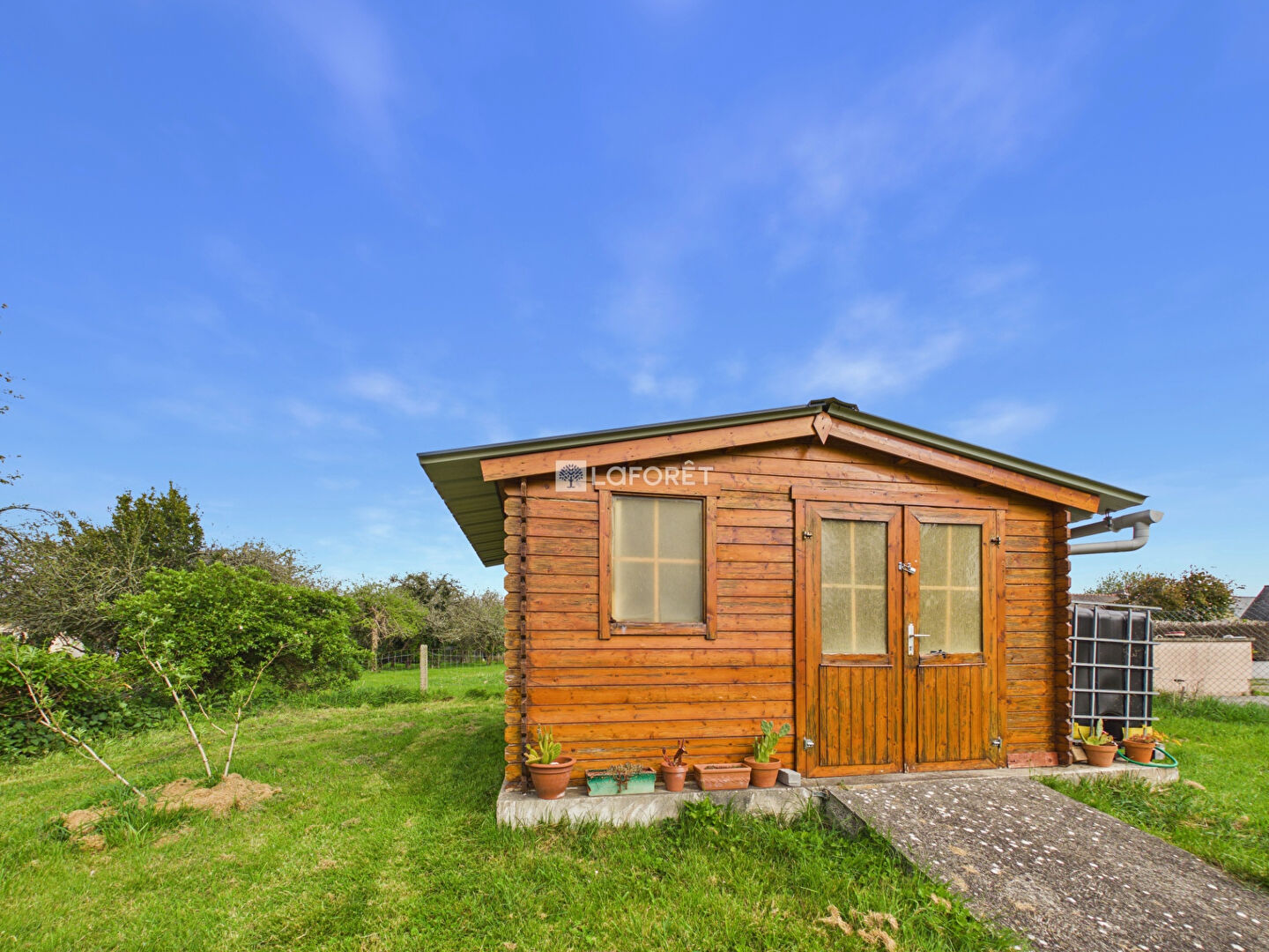 À l'extérieur : terrasse en bois, abri de jardin (15 m²) et stationnements.