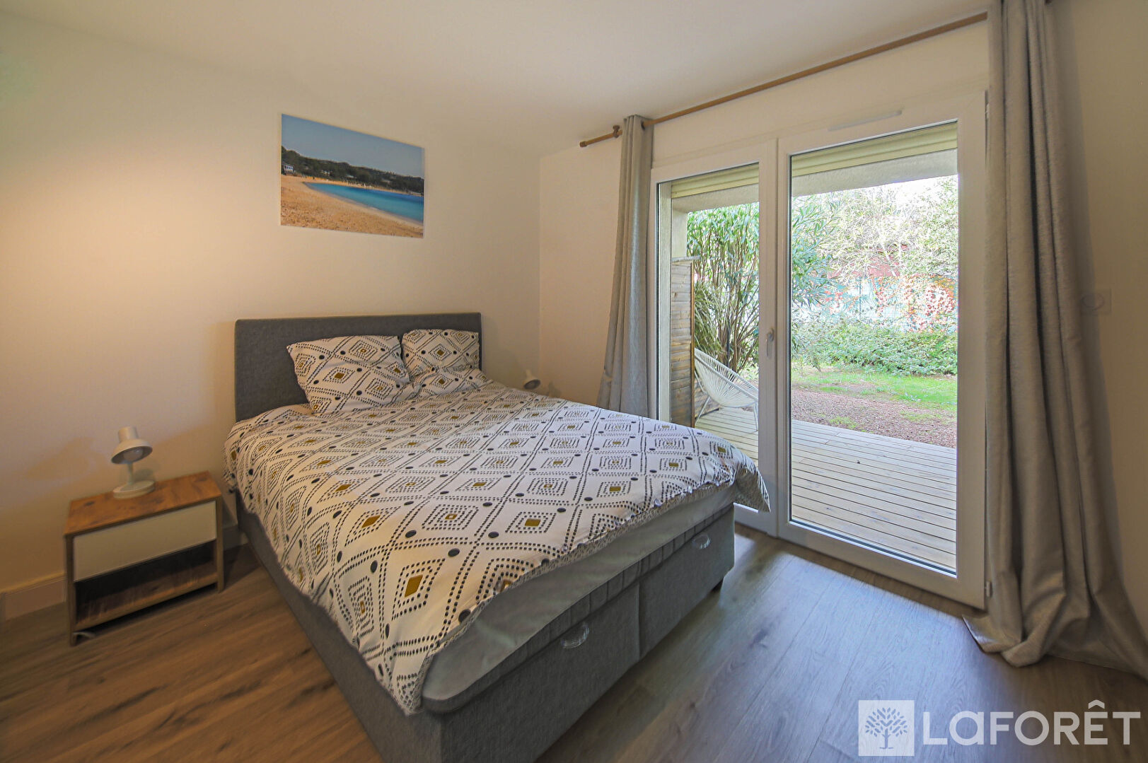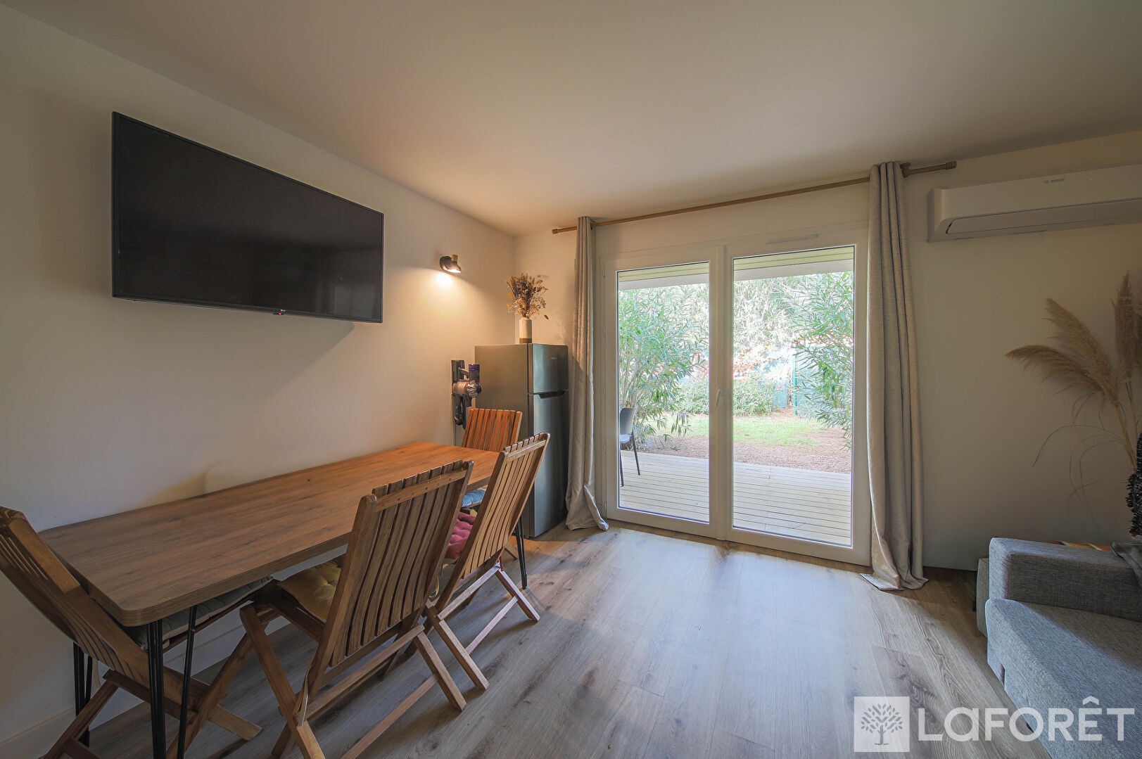 Le séjour climatisé s'ouvre sur une agréable terrasse / jardin sans vis à vis, parfaite pour profiter de moments conviviaux, cuisine ouverte entièrement équipée.