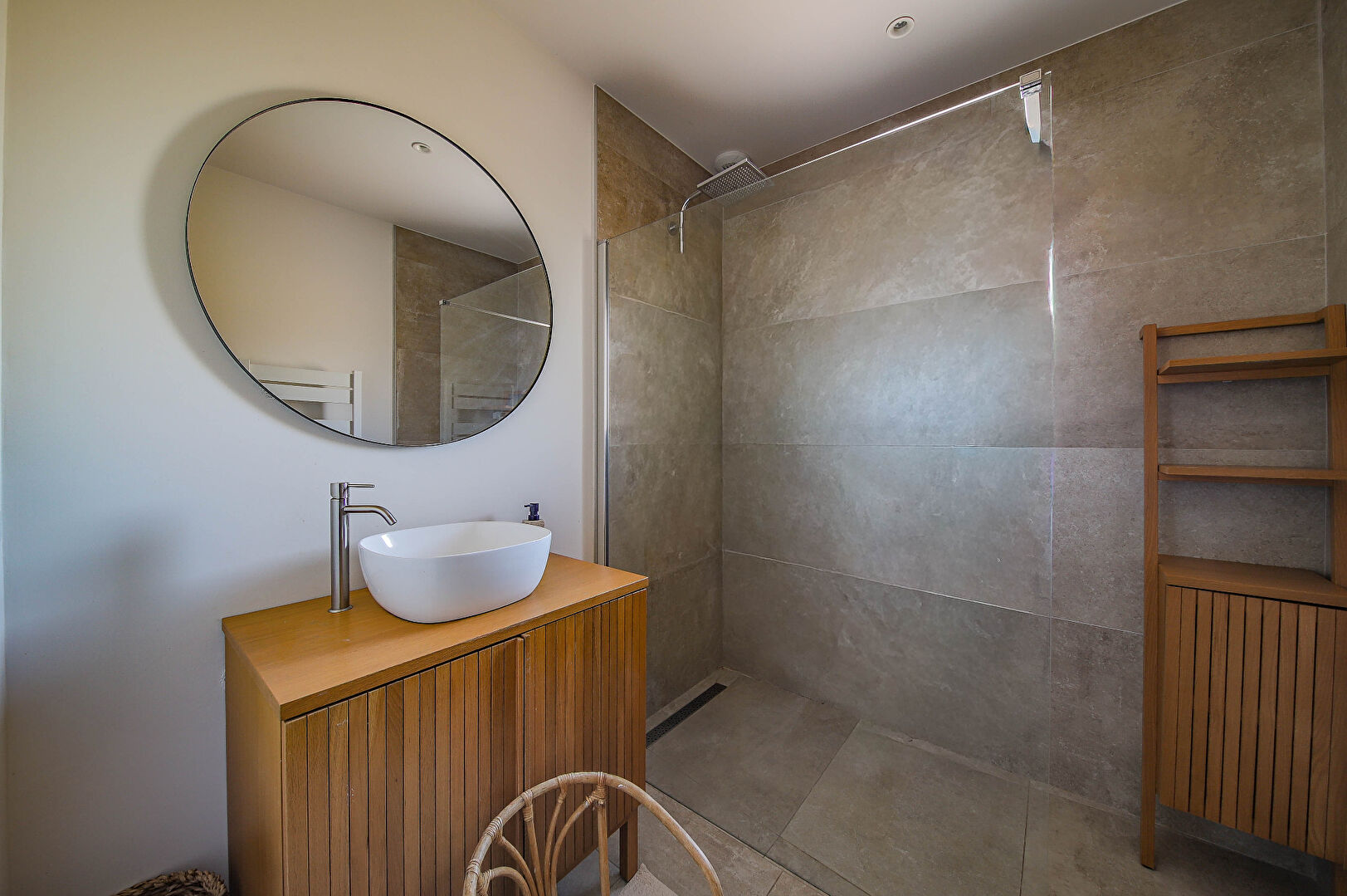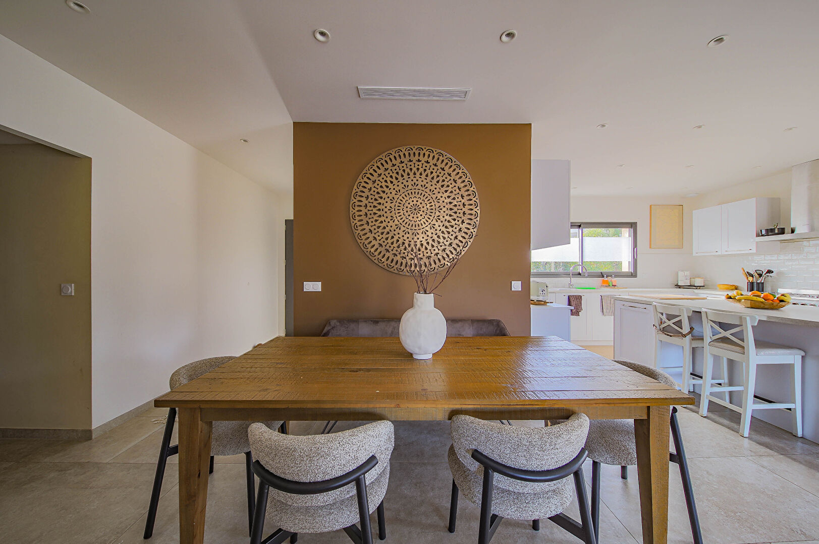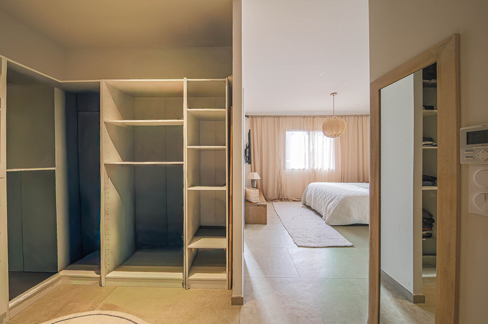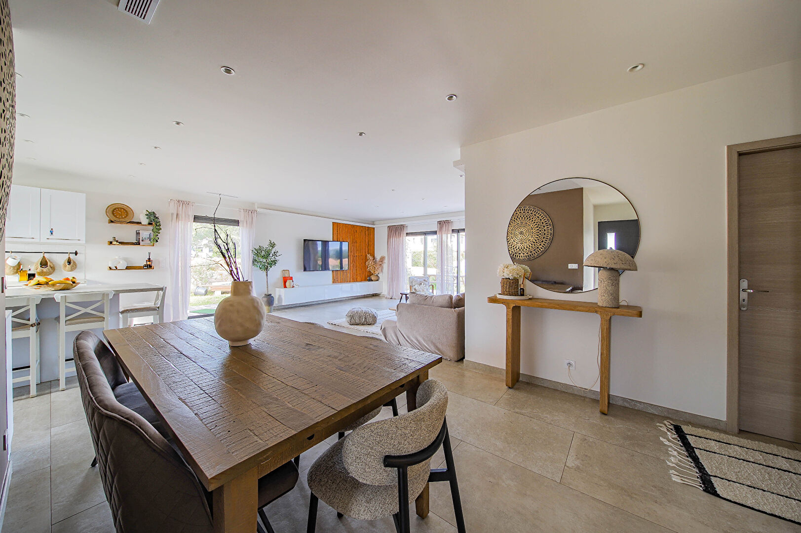 La villa comprend une entrée avec vestiaire, une belle pièce de vie lumineuse avec cuisine américaine, un cellier, deux chambres sur terrasse, une salle d'eau, toilettes indépendants, et une suite parentale comprenant une chambre, dressing, bureau, et salle d'eau avec toilettes.