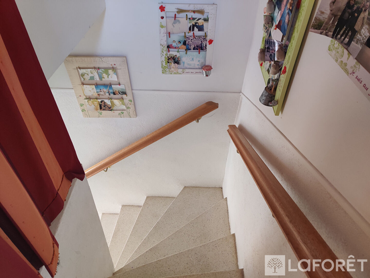 Composée au rez-de-chaussée, d'une chambre et d'une salle de douche avec WC et d'un débarras et à l'étage la cuisine ouverte sur le salon et l'accès balcon.
