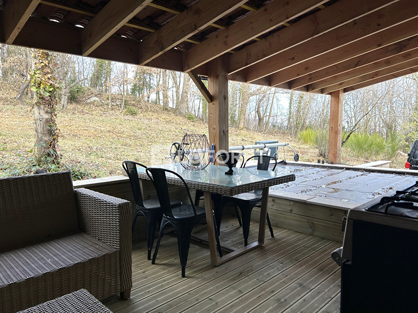 Le hall d'entrée s'ouvre sur un grand salon/salle à manger équipé d'un poêle à granulés, avec un accès direct à la terrasse et à une piscine alimentée en eau de source.
