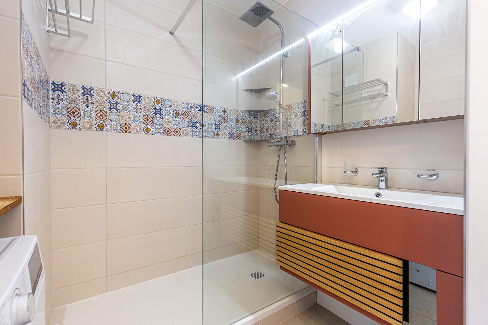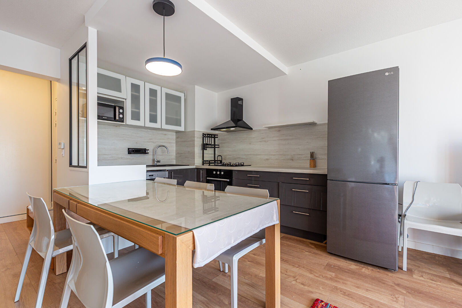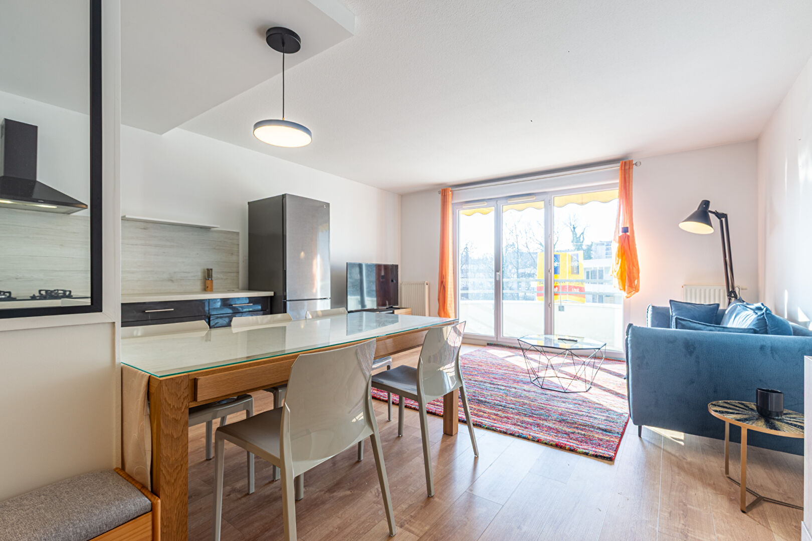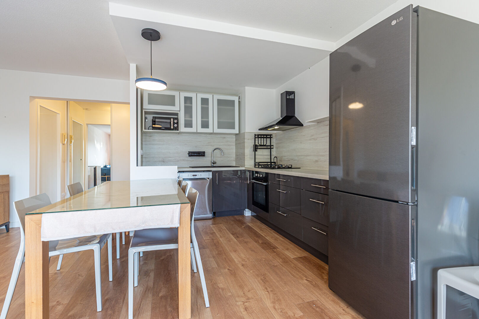 L'entrée dispose d'un espace dégagé avec placard et mène au salon ouvrant sur un balcon. La pièce de vie salon/cuisine, très lumineuse, propose 30 m² d'espace convivial avec une cuisine fonctionnelle et bien agencée.