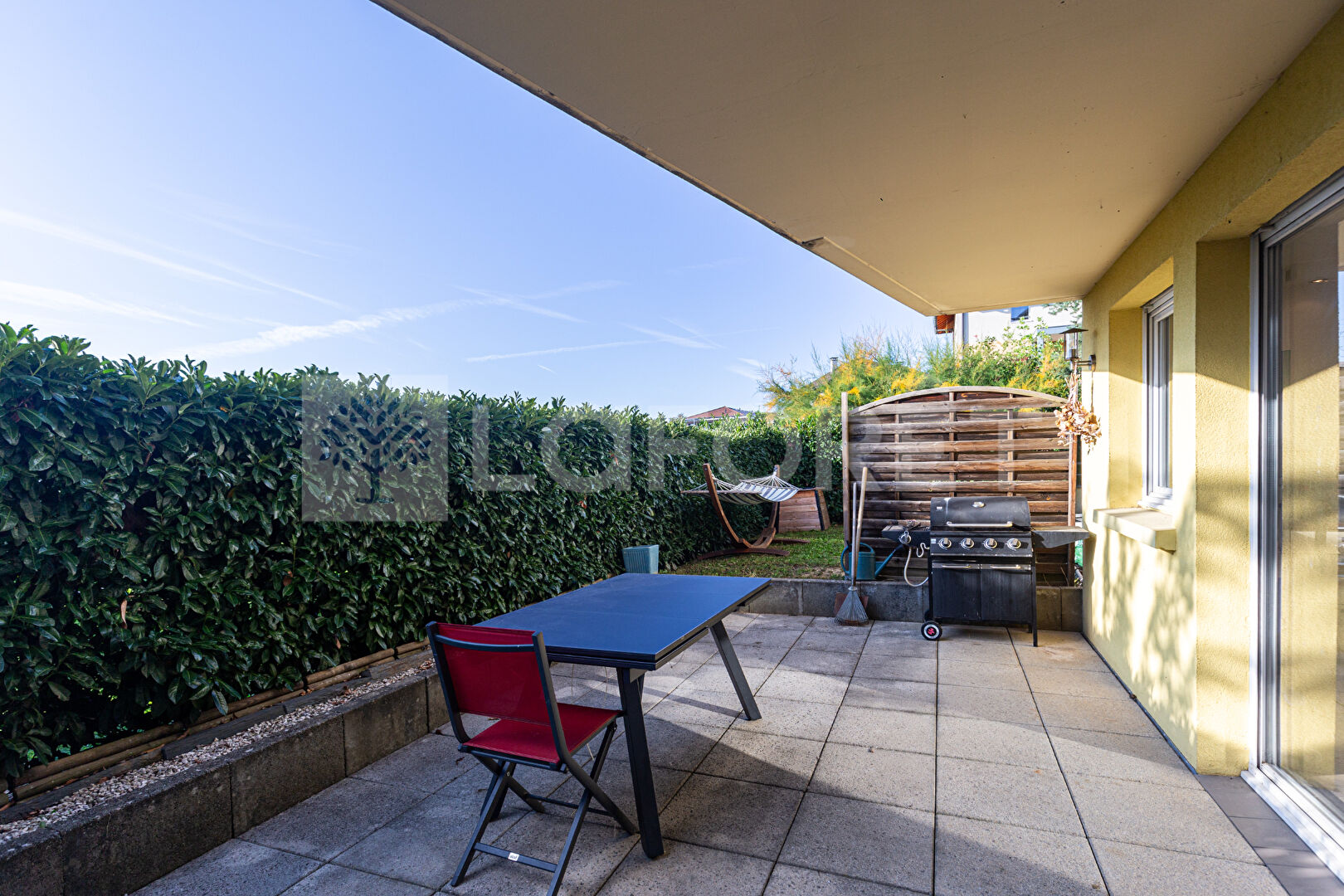 Depuis le hall d'entrée aménagé par des rangements, vous accédez à une agréable pièce de vie avec cuisine équipée de 27 m2 donnant sur une terrasse de 20 m2 et un jardin privatif de 70 m2 au calme et sans vis-à-vis.
