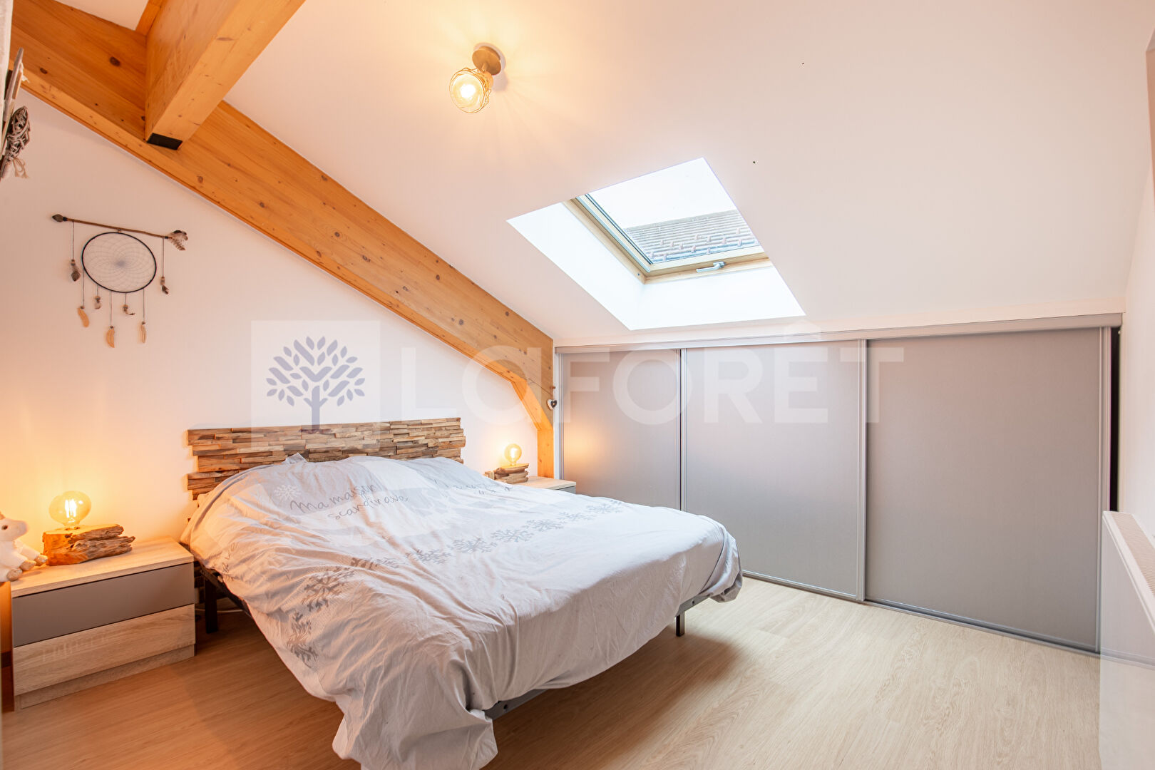 Côté nuit, se trouvent deux chambres avec placards, et une salle de bains avec W.C.